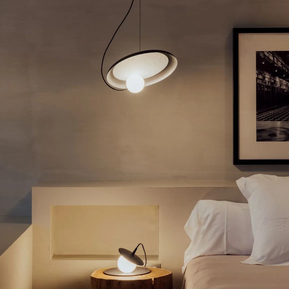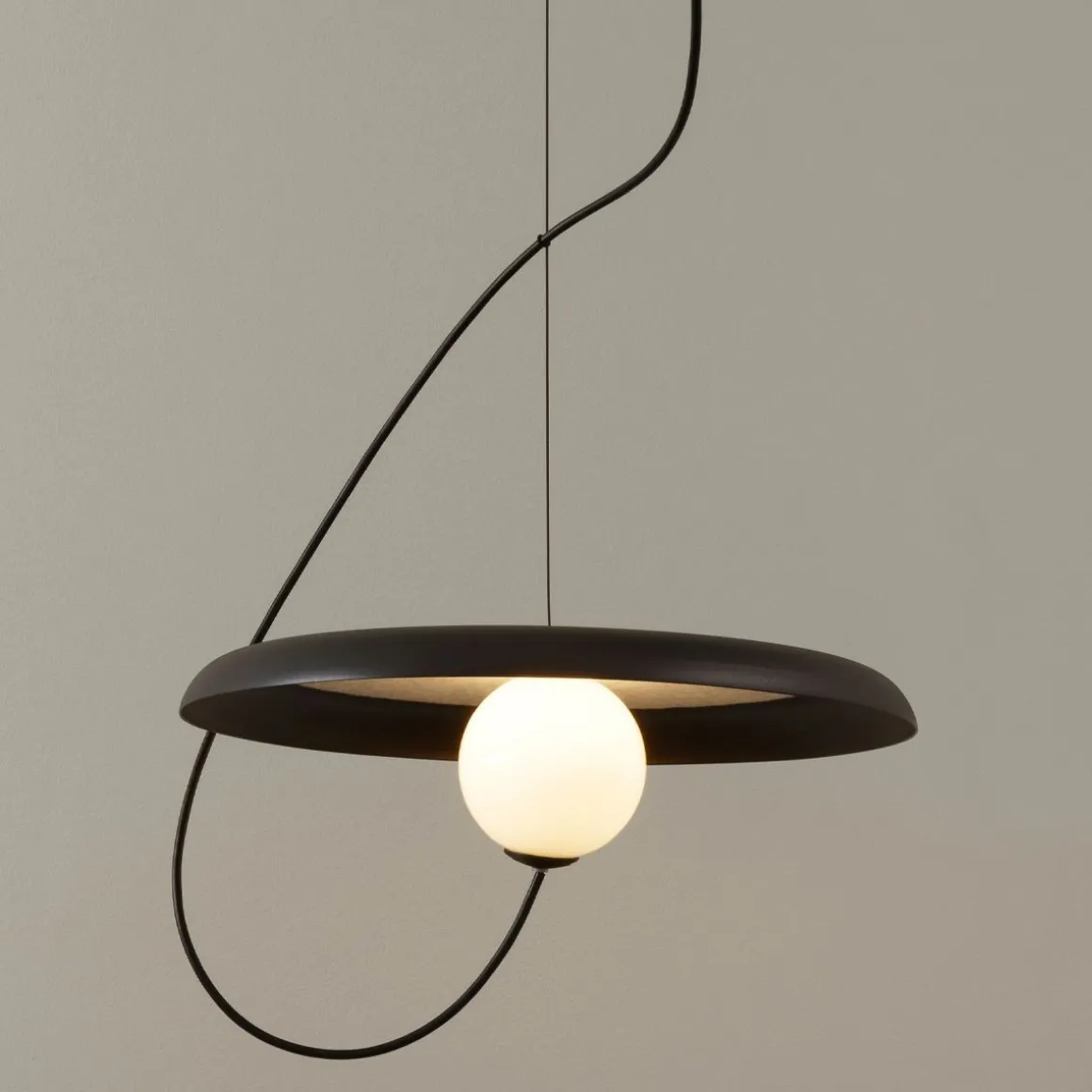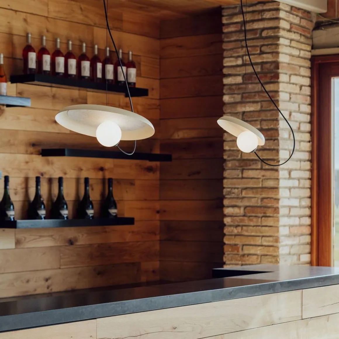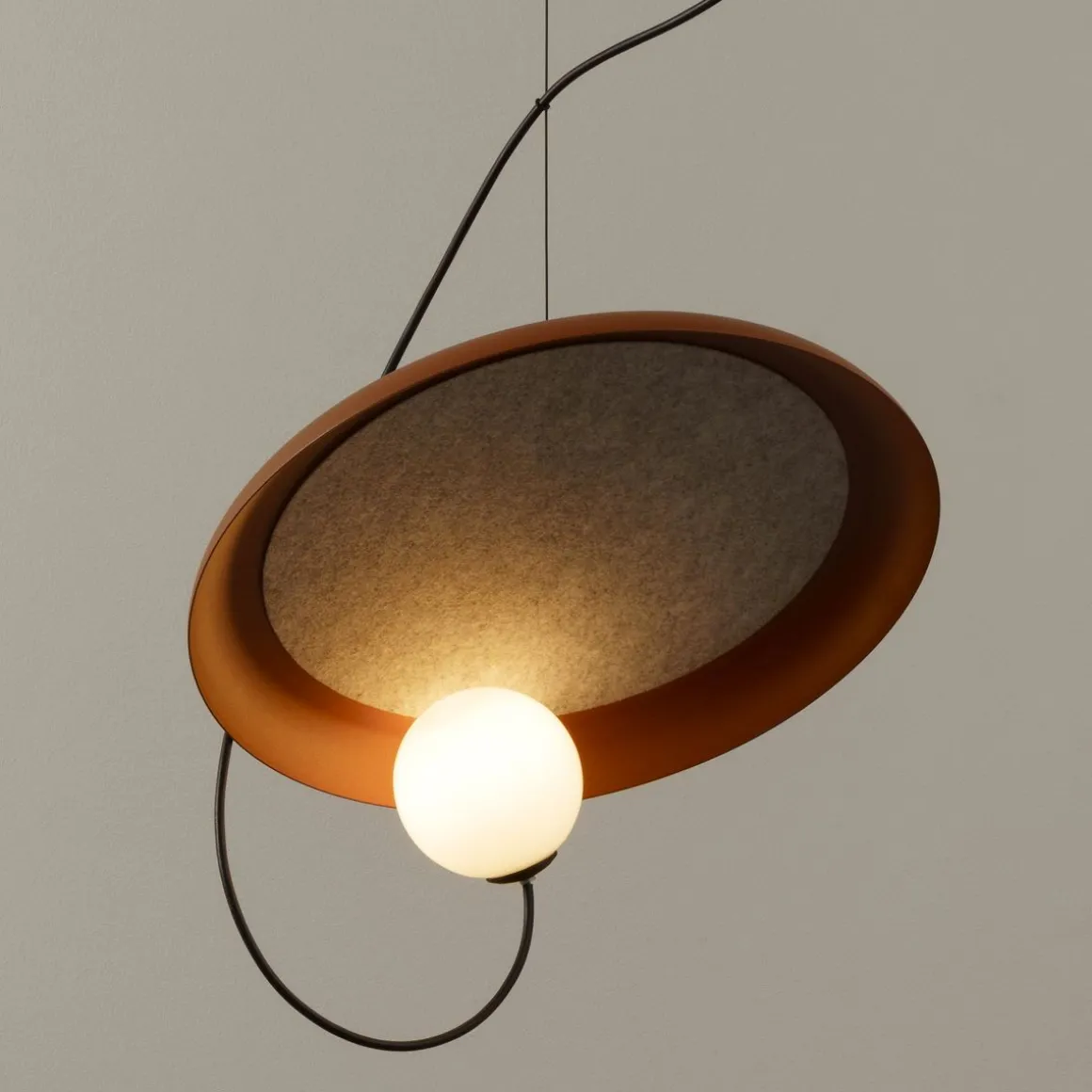 Cette collection de luminaires joue avec le fil conducteur entre l’abat-jour en verre et l’abat-jour traditionnel. L’abat-jour en verre se déplace légèrement sur le revêtement de l’abat-jour traditionnel, qui agit à son tour comme un isolant acoustique. La partie en verre de l’abat-jour est fixée à la partie traditionnelle par le biais d’un aimant qui crée un champ magnétique subtil. Ce luminaire est disponible en trois couleurs et en versions : suspendue, lampadaire et applique murale. Les différentes couleurs et versions le rendent parfait pour les espaces où l’on veut générer du rythme et du dynamisme.