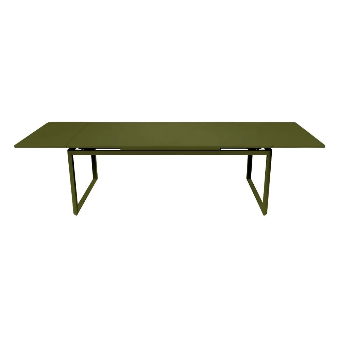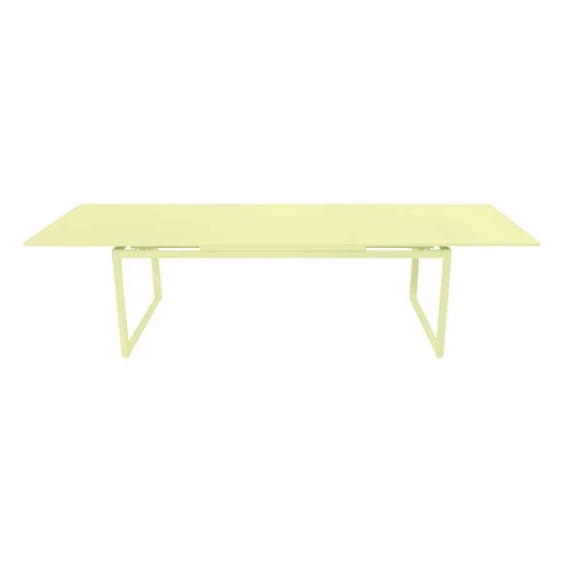 Table à allonges Biarritz de Fermob. La table à allonges Biarritz, née de la créativité du Studio Fermob, s’adapte à votre nombre d’invités. Petit comité ou grandes assemblées ? Elle convient dans tous les cas, passant de 2 m à 2,50 m avec une allonge, et jusqu’à 3 m si besoin, avec deux allonges, ce qui permet d’accueillir jusqu’à 14 personnes ! Futées, ses rallonges latérales de 50 cm chacune, très pratiques à installer en bout de table : il suffit pour cela de les faire coulisser. Tirez-en une et hop, voilà votre invité de dernière minute installé ! Et pour les ranger, c’est facile : elles se glissent sous le plateau et sont alors complètement dissimulées. Le piètement aluminium et le plateau acier de cette grande table de jardin lui garantissent une durabilité exceptionnelle, comme à tout le mobilier, grâce notamment au traitement anti-corrosion et anti-UV. Ainsi qu’à la solidité des matériaux qui la composent et à sa conception. Une cale de table pour l’hivernage permet d’éviter que l’eau s’accumule sur son plateau à la saison froide.