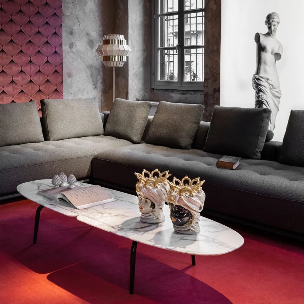 Coloris : marbre gris Calacatta, marbre rouge Lepanto, marbre Sahara Noir