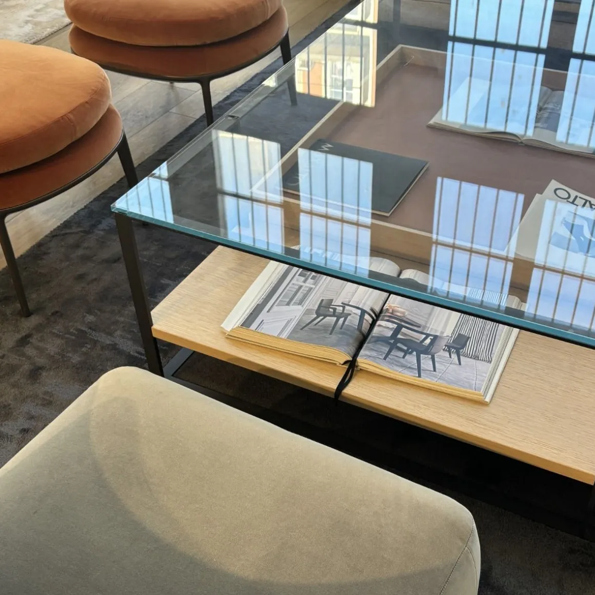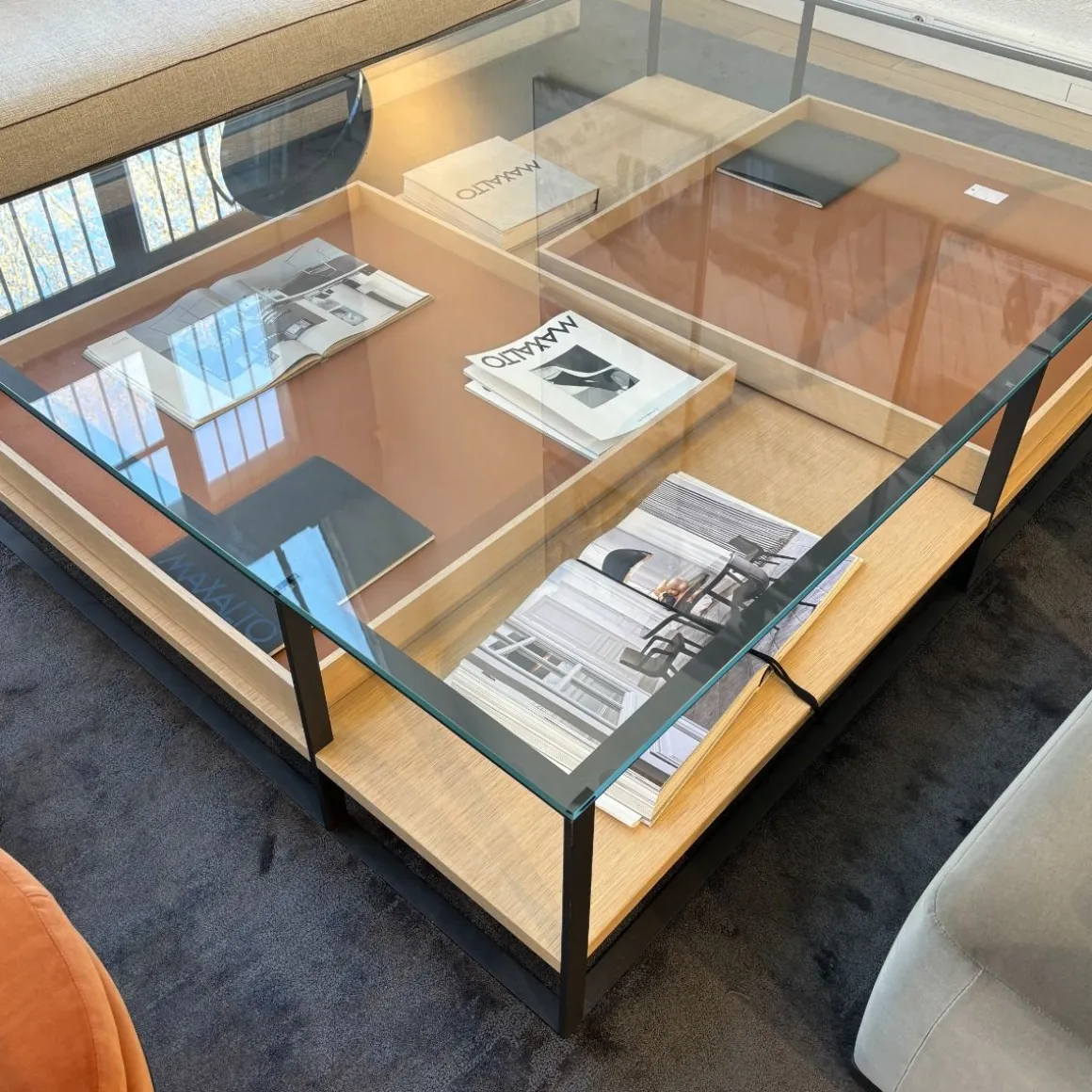 Finitions : Structure en graphite peint, Plateau en verre, Base en chêne clair, Revêtement en cuire Alfa Orange.