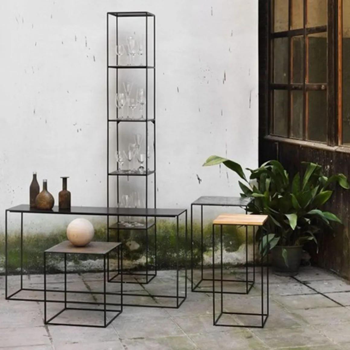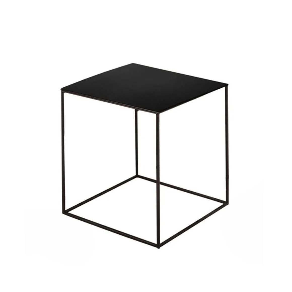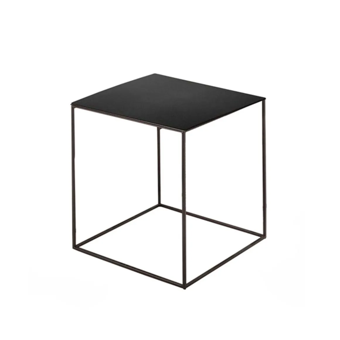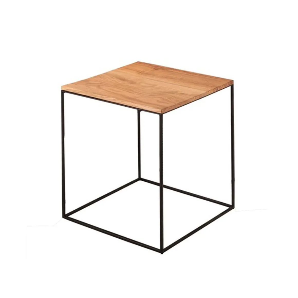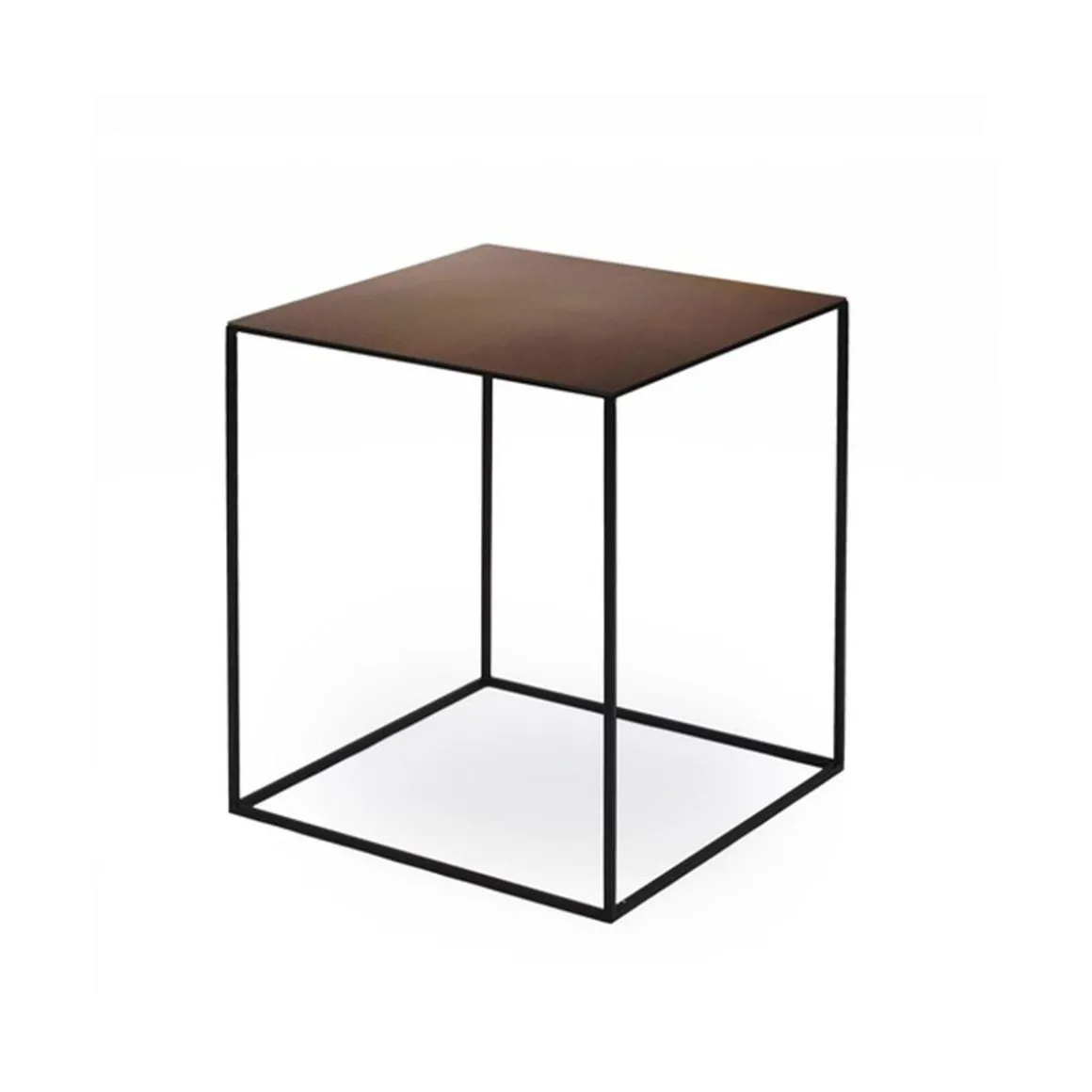 Matériaux : table basse profilée en acier carré, plateau en tôle d’acier épaisseur 2 mm, peinture époxy, ou bois massif
