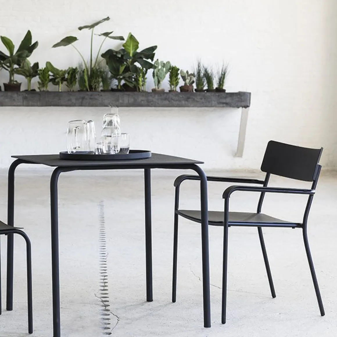 La vision de Vincent Van Duysen se veut limpide : loin de tout exubérance, un objet design doit s’intégrer dans son environnement. C’est précisément le cas de sa collection August pour Serax. La table minimaliste en aluminium thermolaqué noir ou gris vert est dotée d’un design solide et dépouillé : le piètement tubulaire fin est surmonté d’un grand plateau carré. Associé aux chaises coordonnées, elle vous invite à savourer un lunch vous invite à savourer un lunch ou un dîner convivial, à l’intérieur comme à l’extérieur.