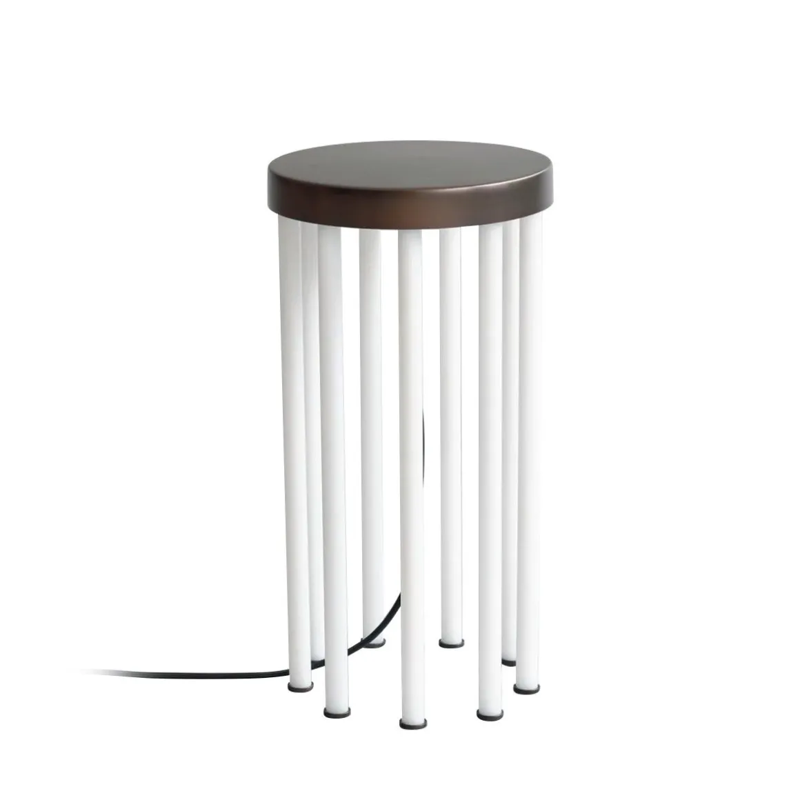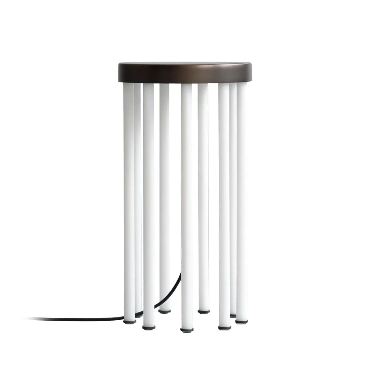 Inspirée par l’esthétique vibrante du néon des années 80, la table Neon fusionne magistralement l’utilité d’une table d’appoint avec la luminescence d’un lampadaire. Son plateau de table plaqué bronze est élégamment soutenu par neuf pieds rayonnants fabriqués à partir de tubes acryliques d’un blanc immaculé. La table Neon est équipée d’une lumière LED intégrée qui offre une durée d’éclairage remarquable de 25 000 heures. Contrairement à la luminescence froide typique associée au néon, ces lampes sont méticuleusement conçues pour émettre une lueur douce et chaleureuse à 2 400 Kelvin, enveloppant les espaces dans une ambiance chaleureuse. La conception légère de la table la rend portable sans effort et elle se connecte facilement à une source d’alimentation via son élégant cordon noir. Tous les composants métalliques présentent un placage en bronze sophistiqué.