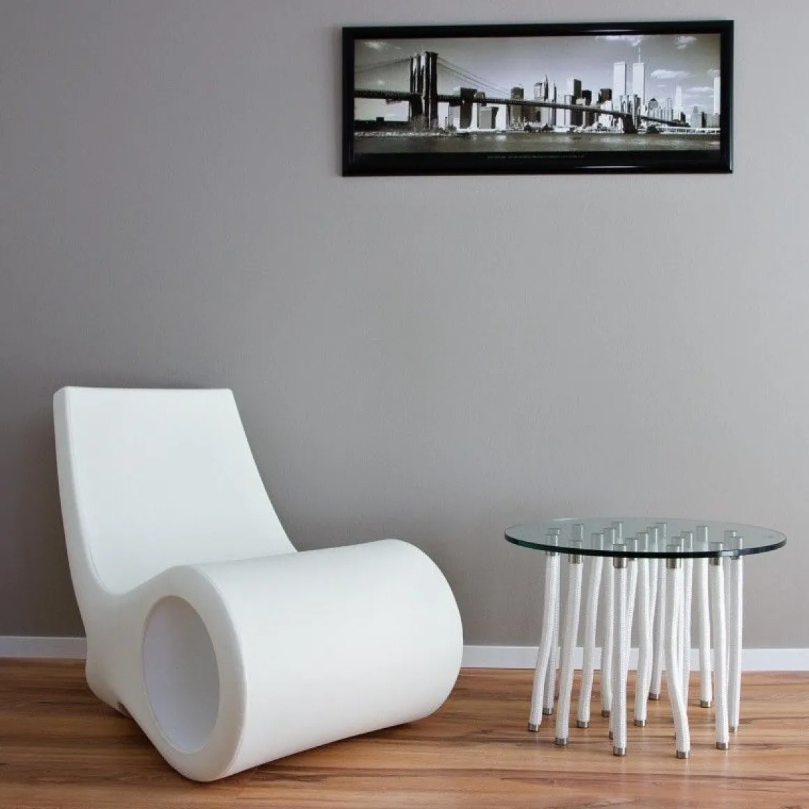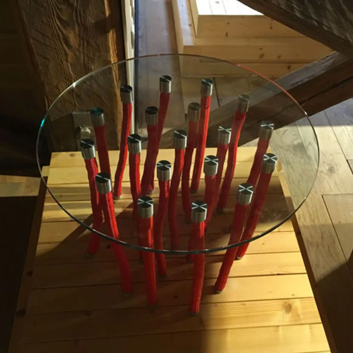 Matériaux : verre transparent trempé, pieds rigides en acier et cordes de polypropylène