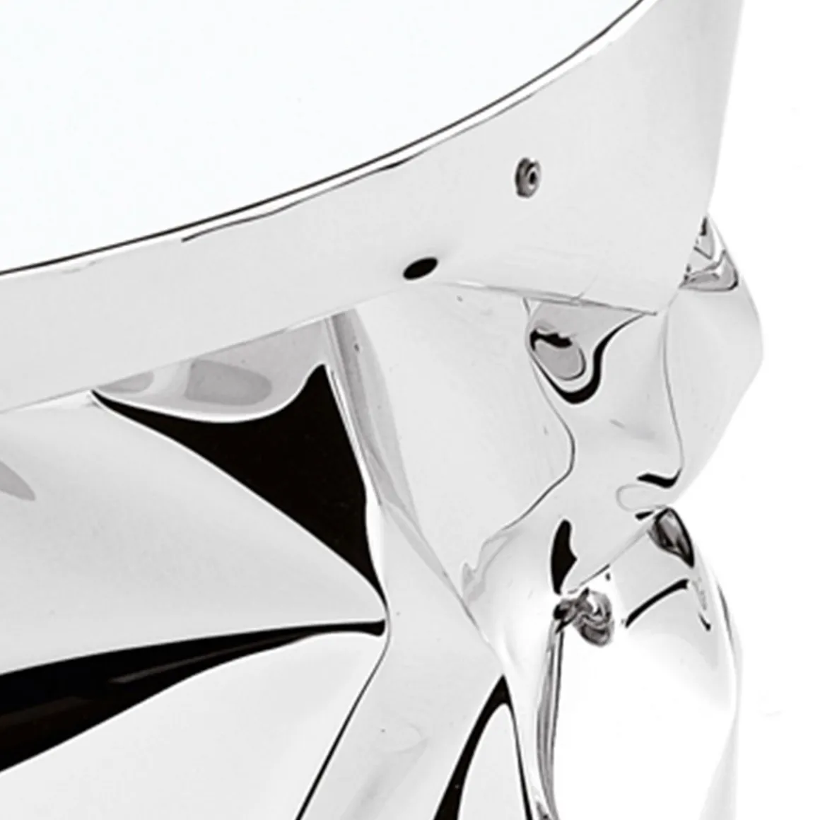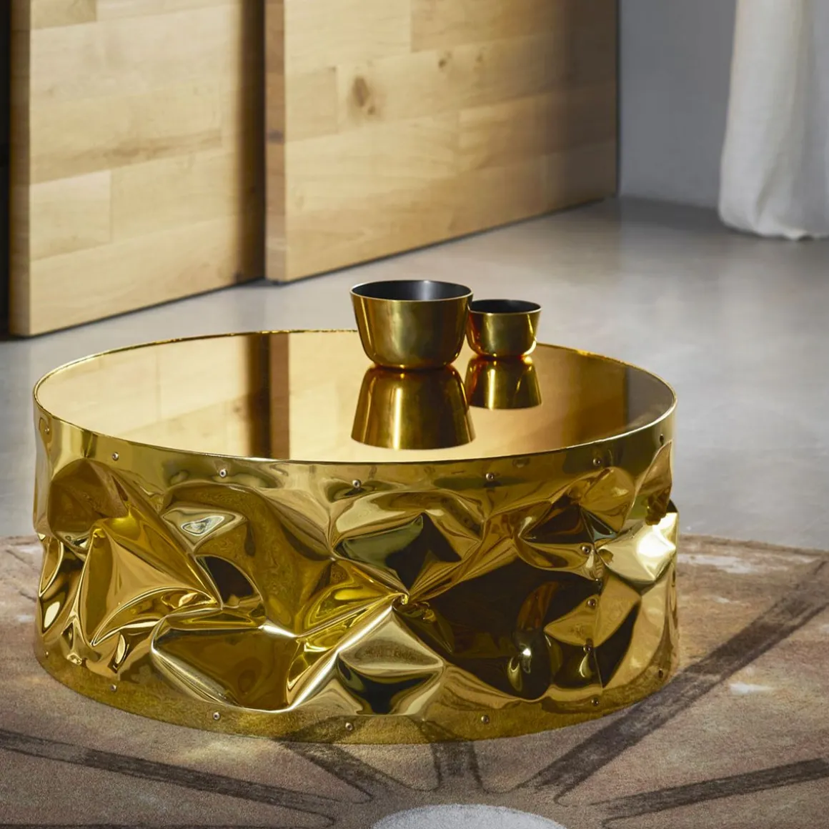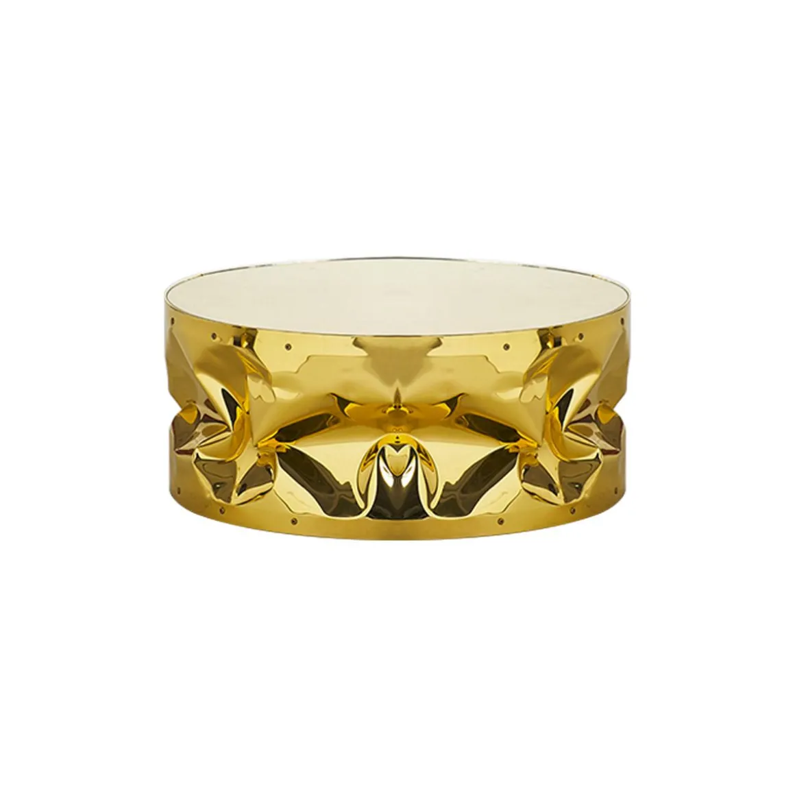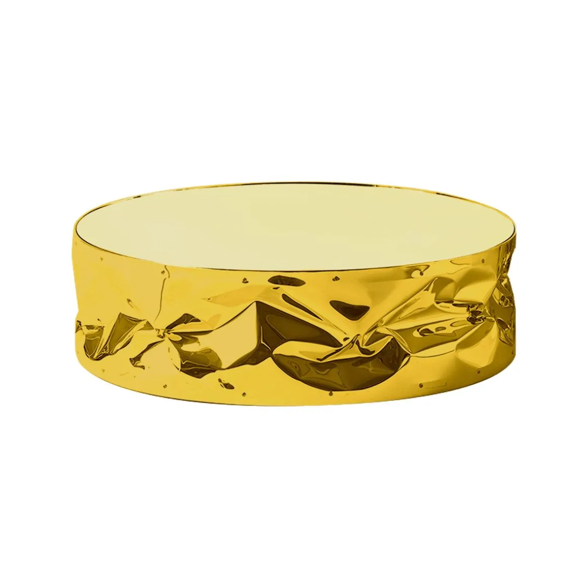 Matériaux : aluminium froissé, structure interne en bois, top en verre miroir