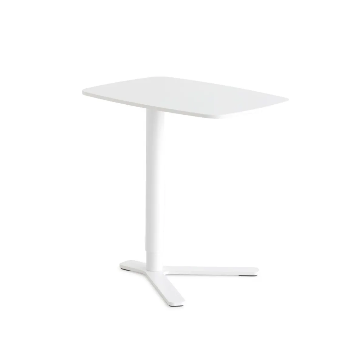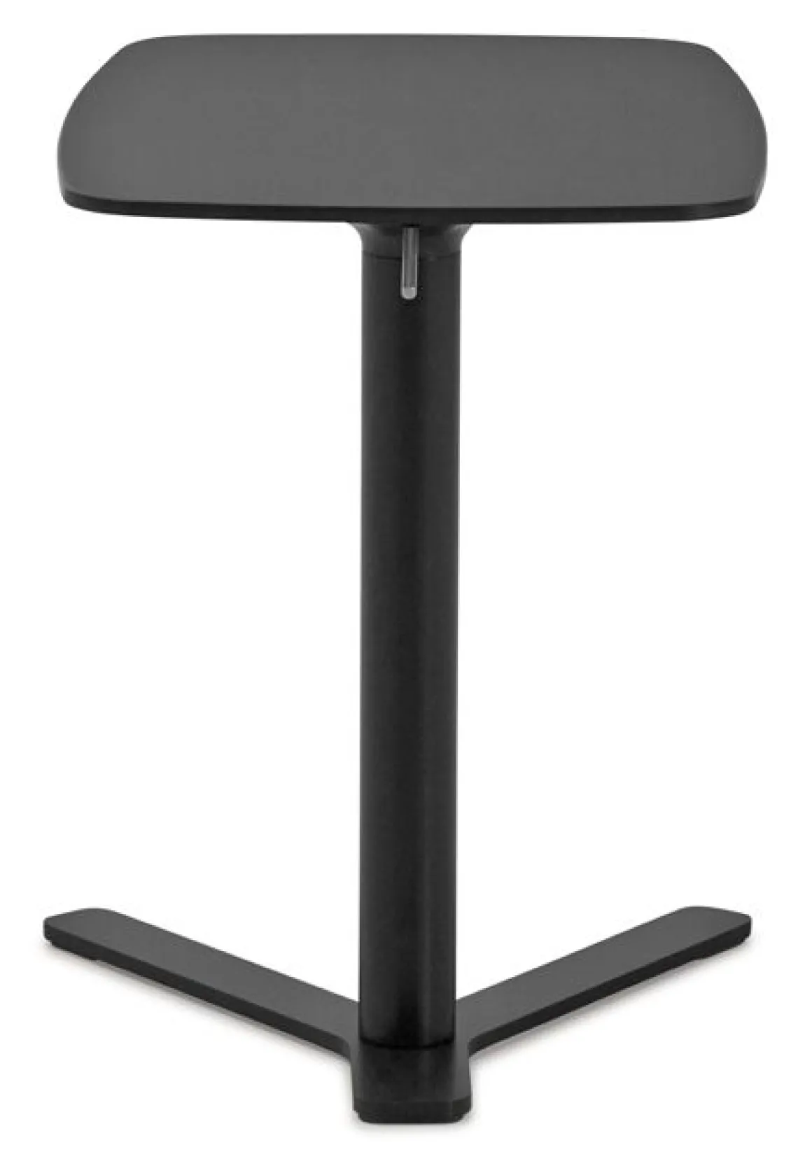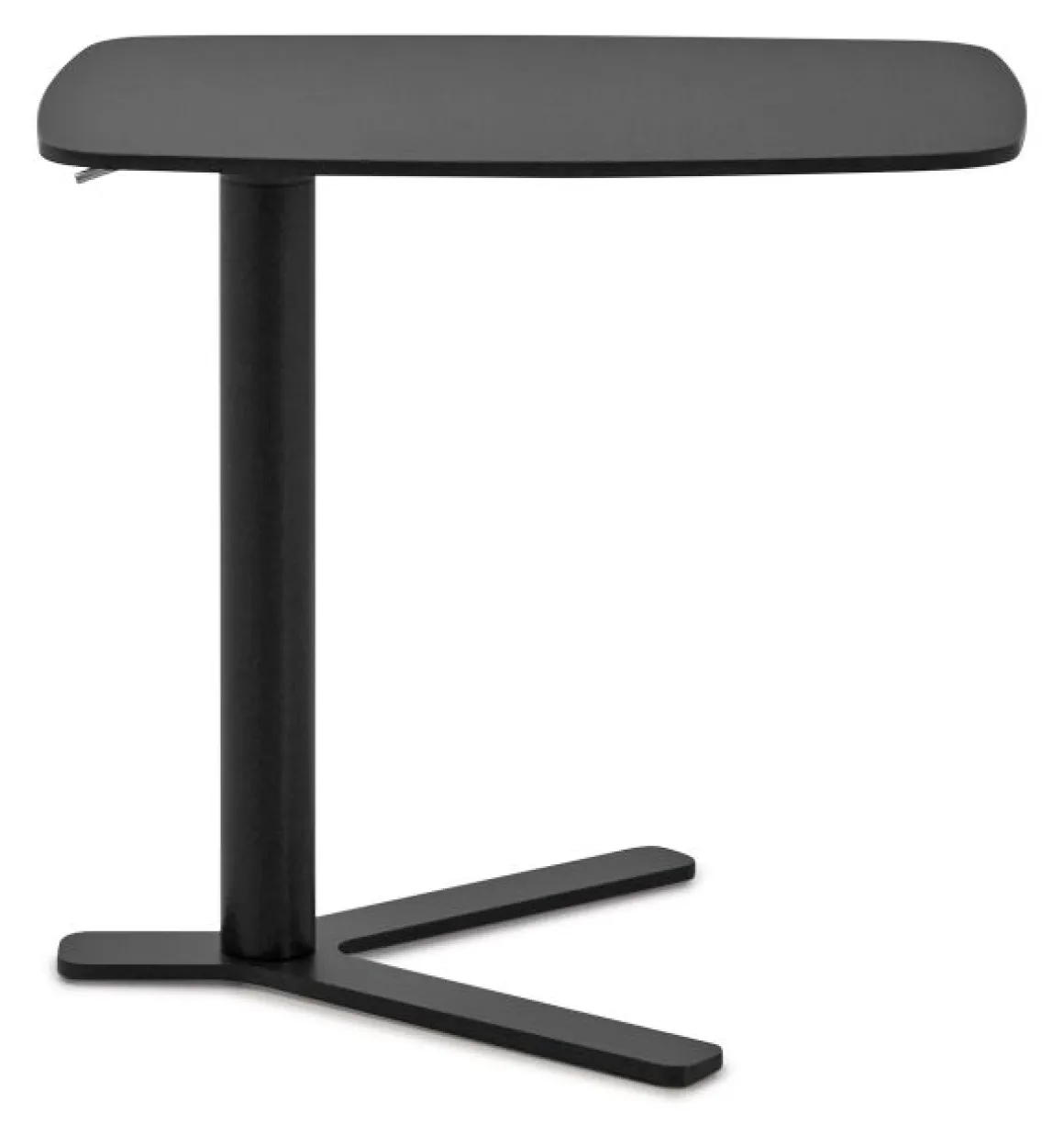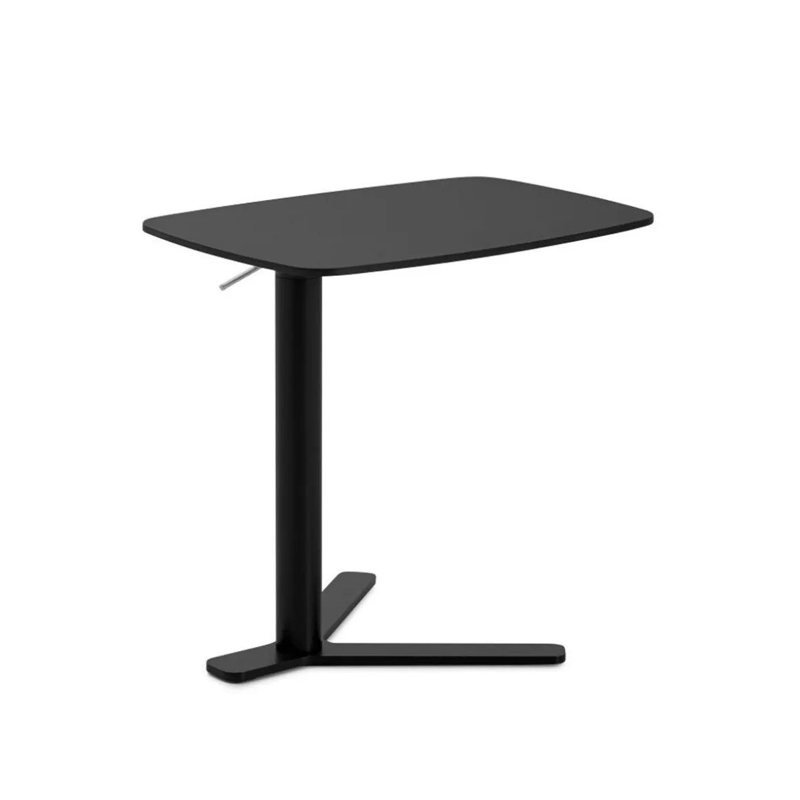 Table d’appoint réglable en hauteur avec bloc élévateur pour haut. Base, colonne et plaque de fixation en métal couvert de poudre. Plateau rectangulaire en HPL Fénix®. Le feutre glisse sous la base.