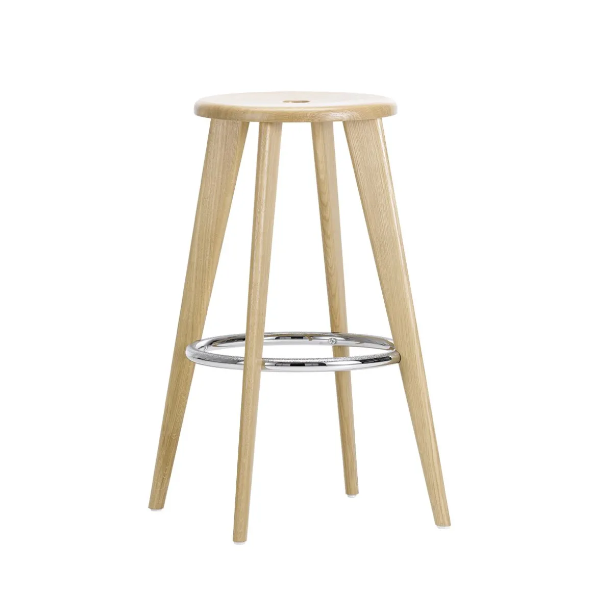 Pour créer le Tabouret Haut, Prouvé s’inspira de la typologie traditionnelle qui est encore utilisée aujourd’hui pour les tabourets de bar. Quatre pieds légèrement inclinés supportent un plateau d’assise rond. Un anneau, qui relie les pieds à environ un tiers de leur hauteur totale, renforce la construction et sert en même temps de repose-pieds. L’interprétation de Prouvé de cet archétype classique convainc par son allure simple sans prétention, la clarté de sa conception et ses proportions harmonieuses.
