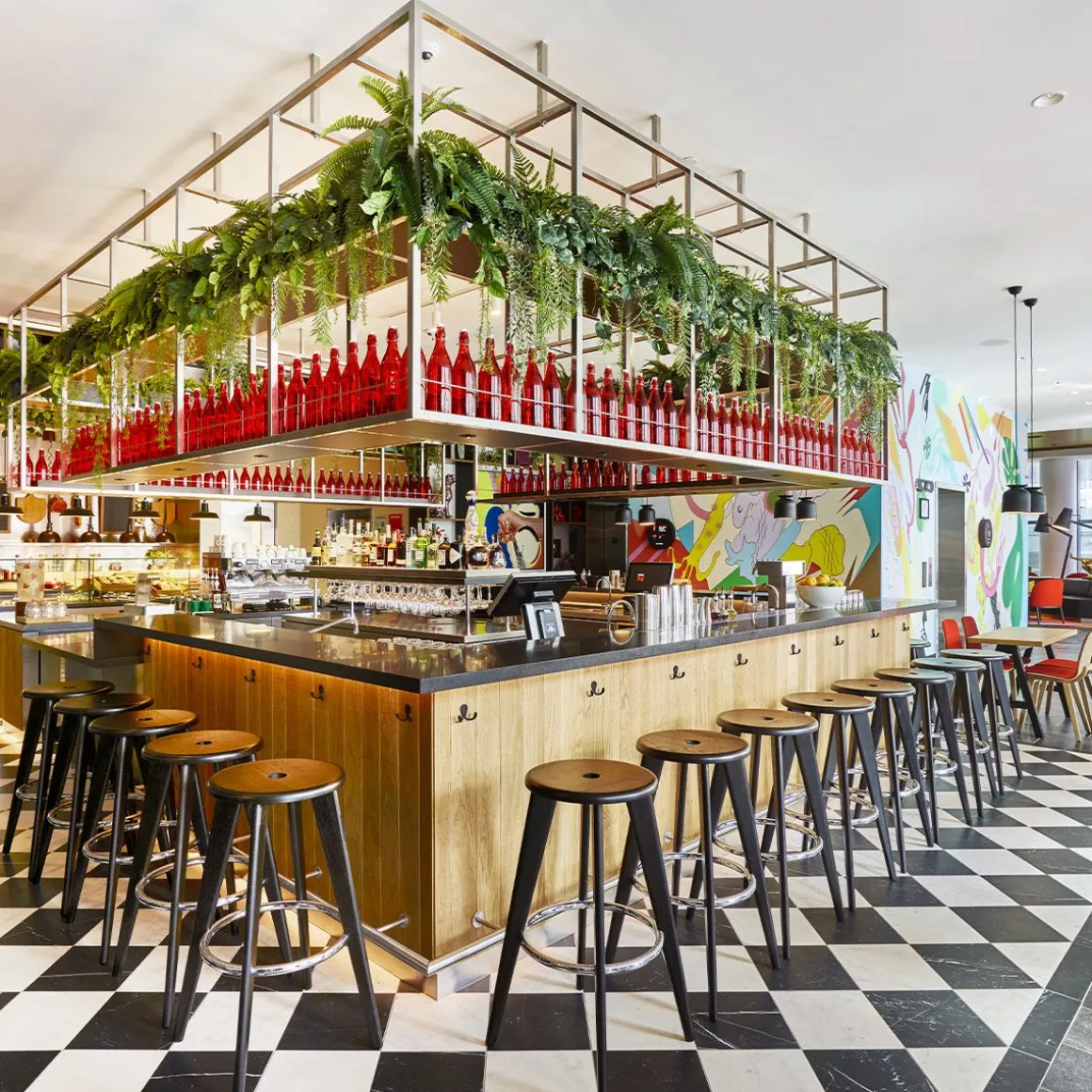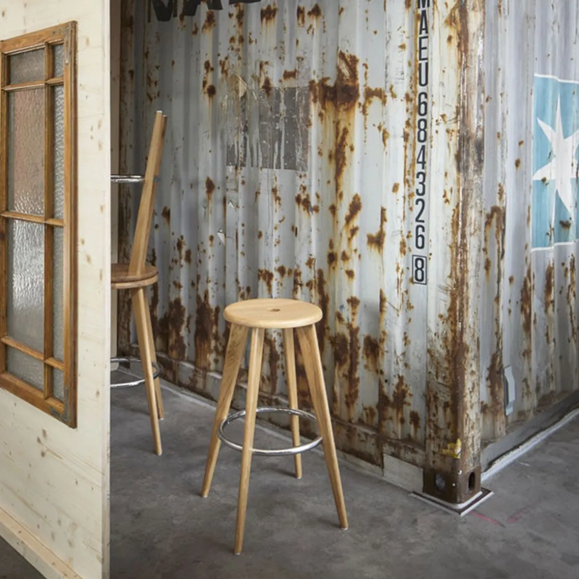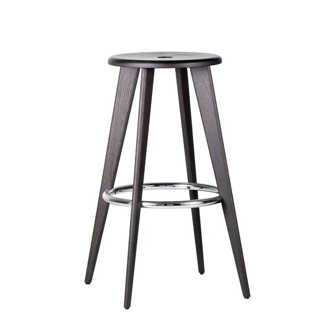 Matériaux : pieds et assise en chêne massif, naturel ou teinté foncé, verni effet bois naturel, repose-pieds en tube d’acier (ou chromé avec surface antidérapante)