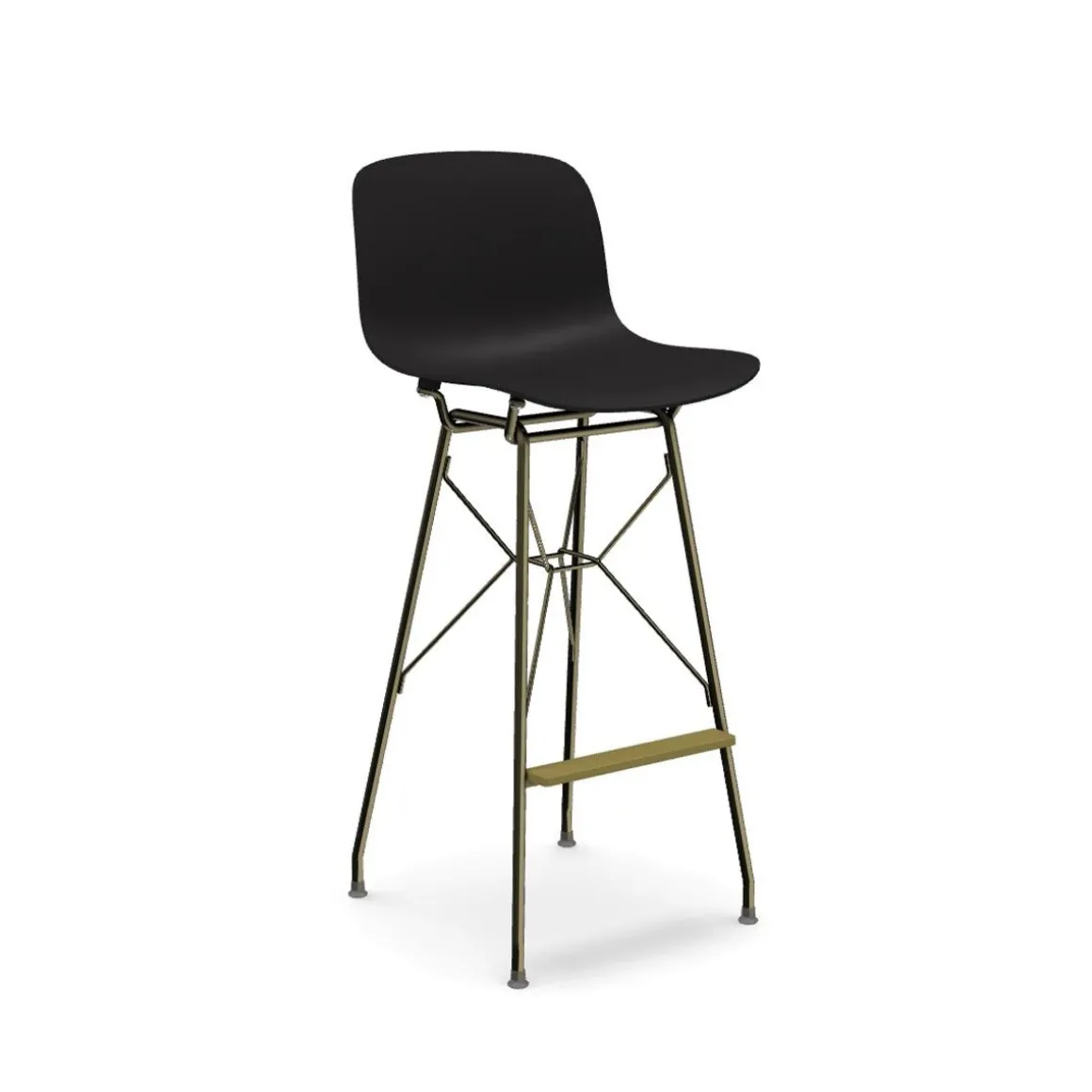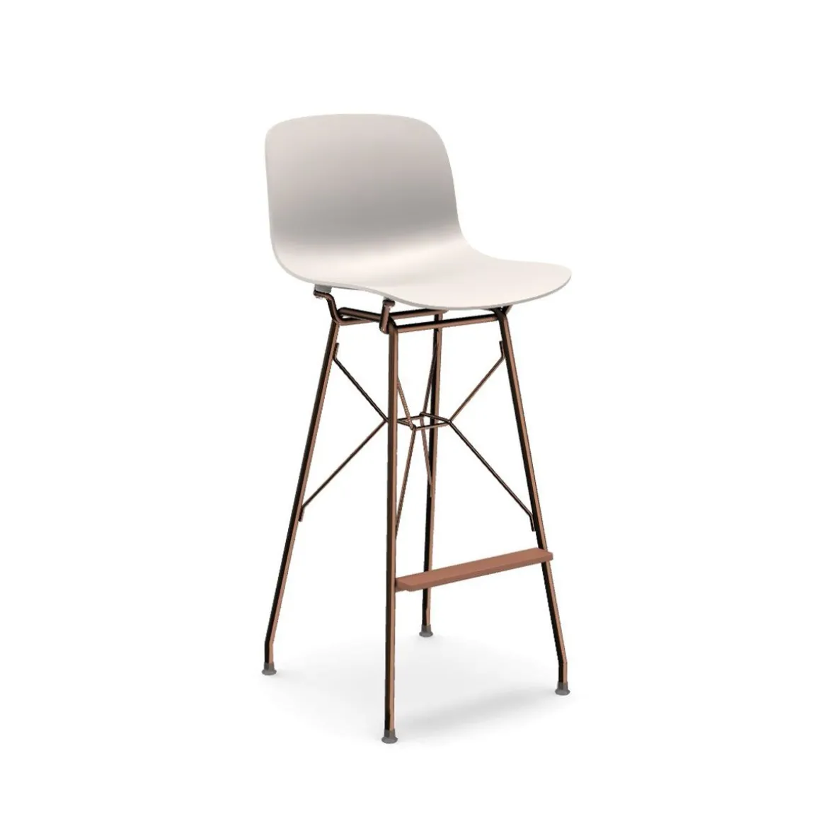 Matériaux : structure en tube d’acier, plaqué ou cuivre ou verni en polyester, assise en polypropylène