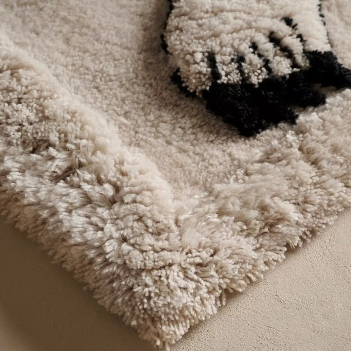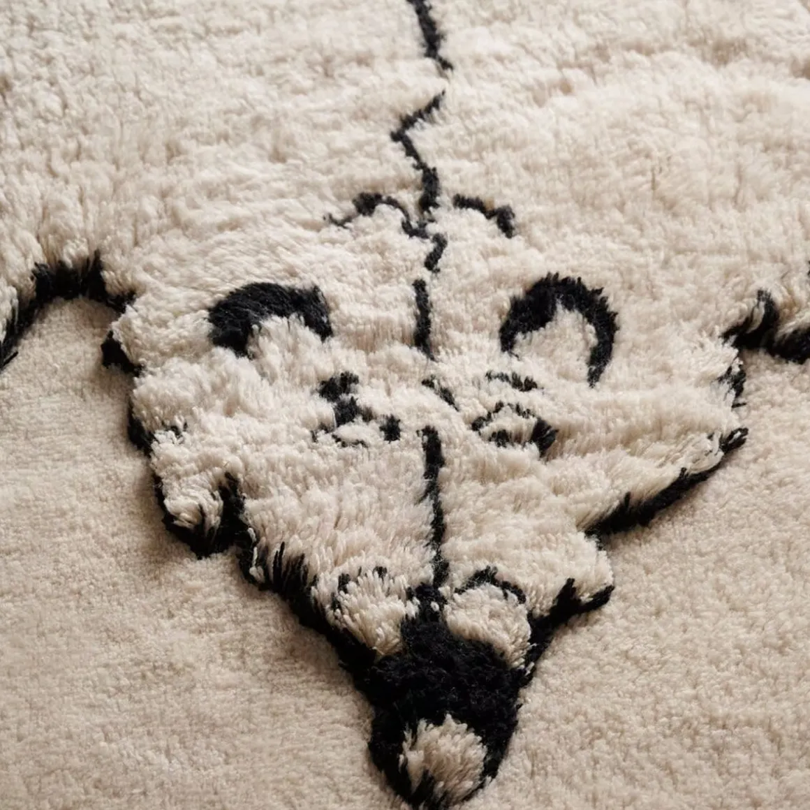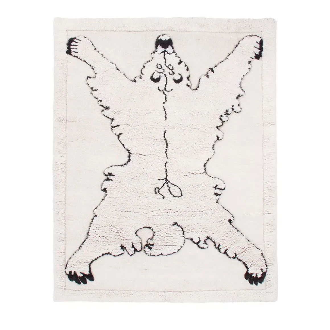 Tapiorso de Amini par Roberto Gabetti et Aimaro Isola. Créés à l’origine sur un métier semi-mécanique, les tapis en pure laine revisités par Amini sont noués à la main et présentent un velours sculpté à deux niveaux. La collection se caractérise par quatre motifs animaliers différents : le léopard, Tapipardo, orange sur fond bleu ; le lion, Tapileo, ocre sur fond jaune ; l’ours, Tapiorso, blanc sur fond ivoire ; et le dragon, Tapidrago, vert sur fond blanc.