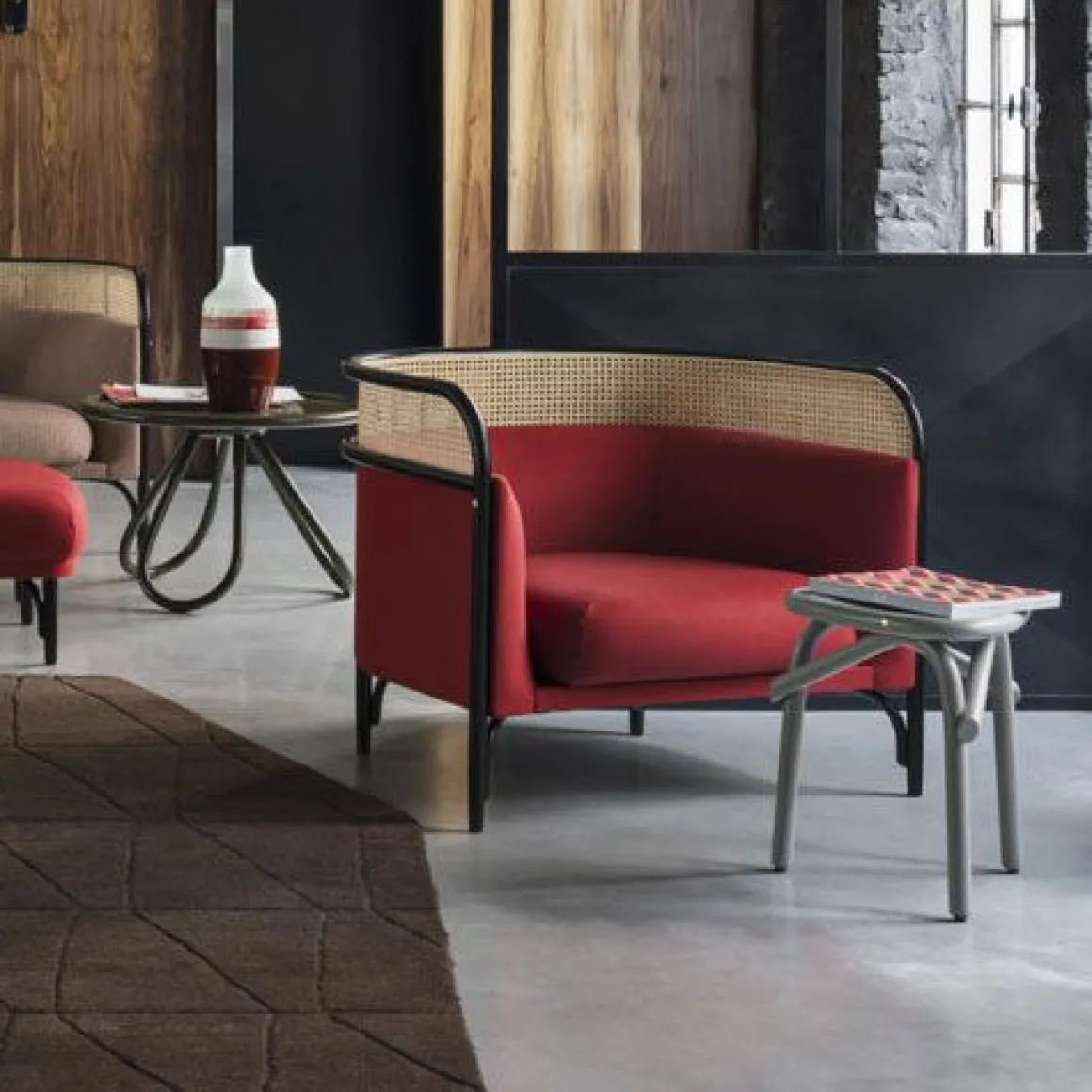 La collection d’assises rembourrées Wiener GTV Design propose une nouvelle idée de confort signée GamFratesi, le duo de designers italo-danois, composés de Stine Gam et Enrico Fratesi. TARGA est une famille constituée d’un élégant canapé deux places et d’un petit fauteuil, des éléments parfaits pour les espaces professionnels destinés à des rapports sociaux plus intimes et rassemblés, ainsi que pour les milieux résidentiels à la personnalité non conventionnelle. Tous les éléments de la tradition de la marque concourent pour définir le profil du projet : la structure en hêtre cintré soutient le large coussin de l’assise et le dossier rembourré qui se termine par un pourtour réalisé en paille de Vienne où est placé l’élément en ellipse, la plaque (targa), qui donne son nom au projet.