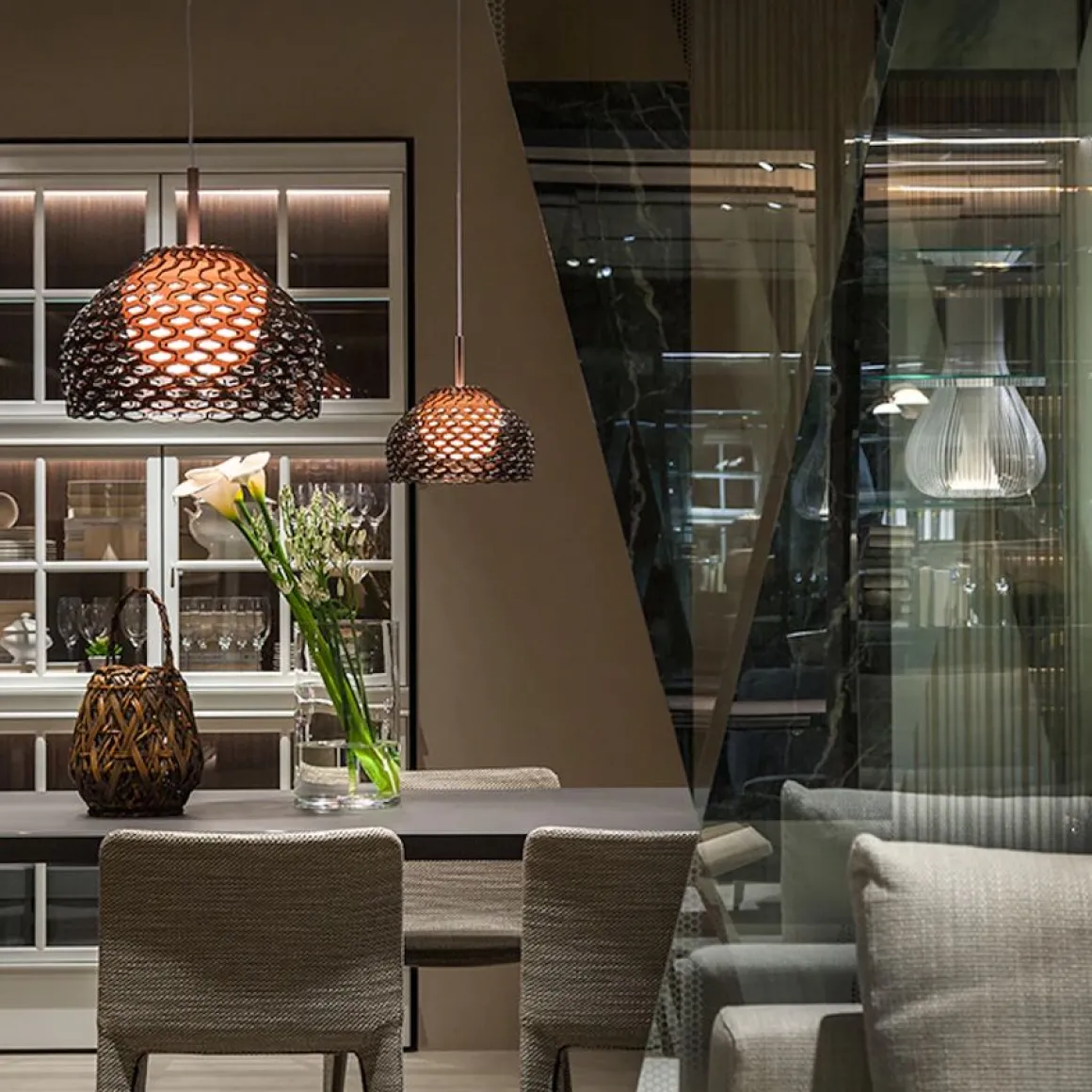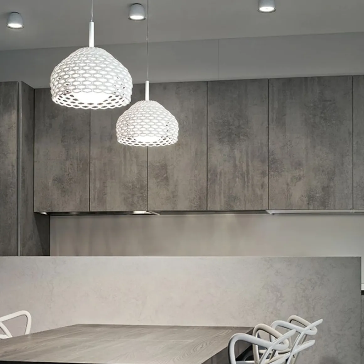 Suspension design à lumière diffuse de Flos créée par Patricia Urquiola, avec diffuseur externe en polycarbonate et diffuseur interne en polycarbonate opale moulé par injection.
