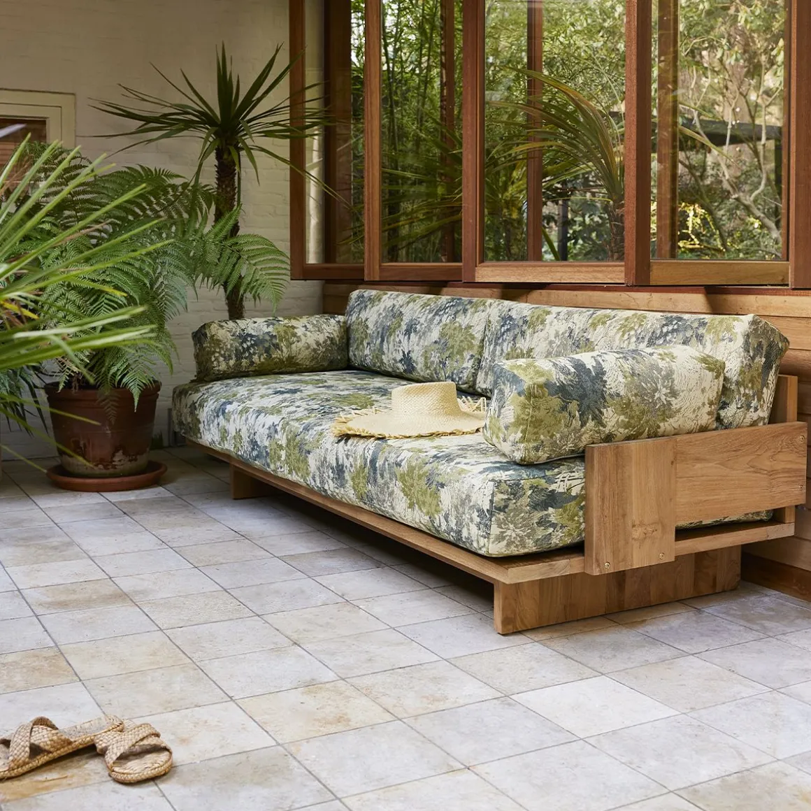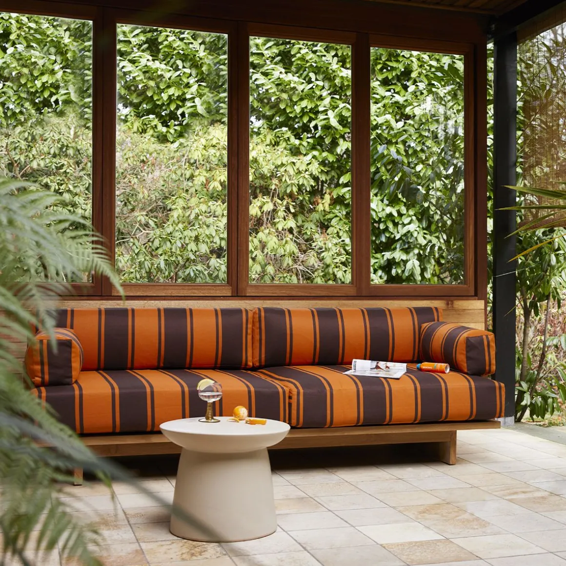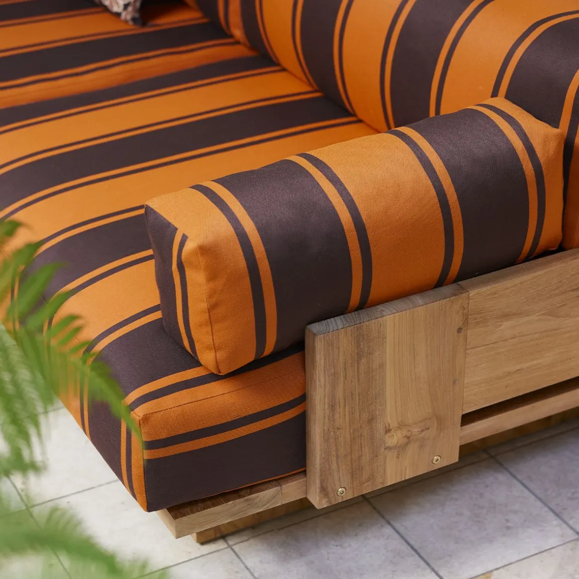 Les bancs et méridiennes d’extérieur sont conçus pour s’intégrer sans effort dans un paysage naturel ou urbain. Destiné à être utilisé sur une plus longue période et à s’embellir au fil des ans. Son cadre en bois de teck épuré embrasse les coussins confortables du canapé, créant un joli coin salon.