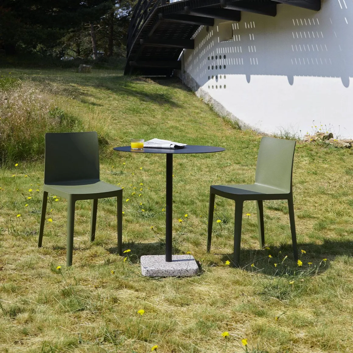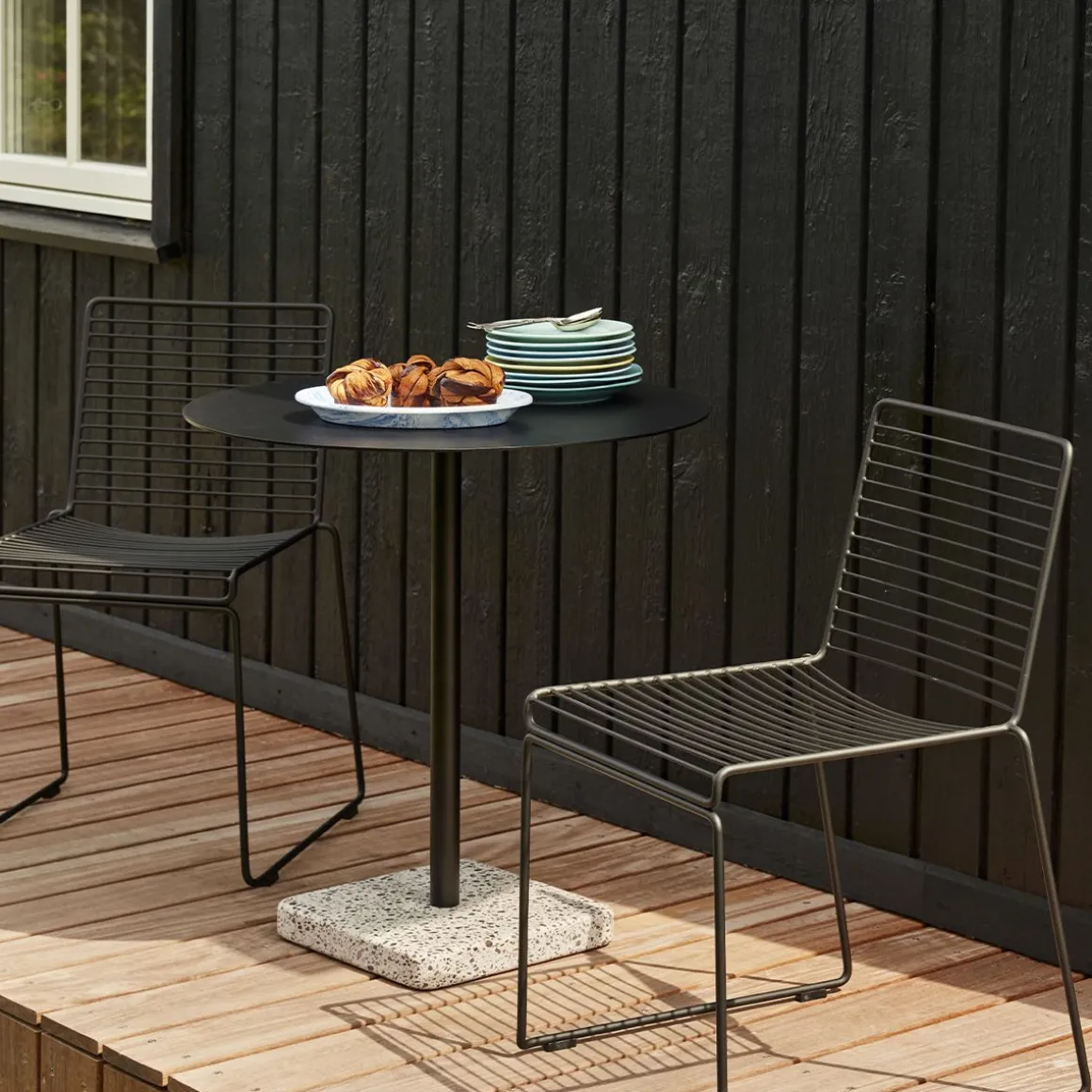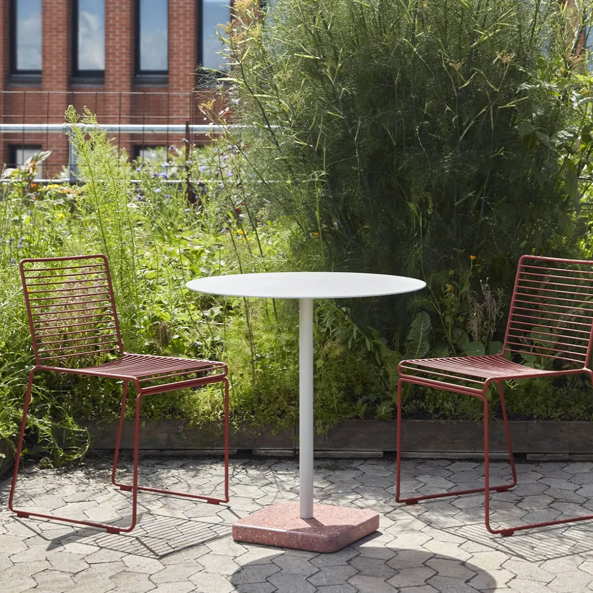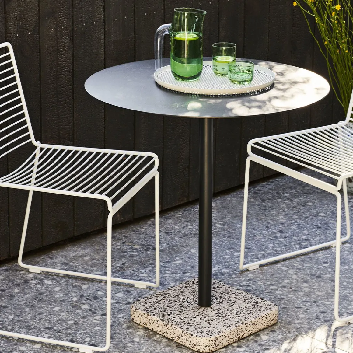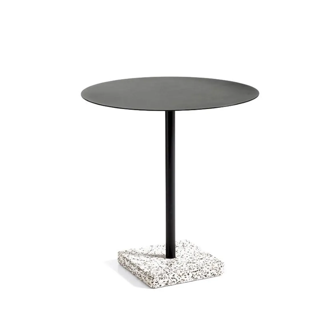 Terrazzo Table de Hay. La table Terrazzo du designer suédois Daniel Enoksso est dotée d’un plateau de forme ronde ou carrée fabriqué en acier électro-galvanisé hautement fonctionnel et revêtu de poudre pour le rendre plus résistant. Pour le designer, le Terrazzo était un choix évident comme base, en partie en raison de ses excellentes propriétés de durabilité, mais surtout, il possède une finition si unique et distinctive qui contraste efficacement avec la simplicité austère du plateau de la table. Conçue pour résister à l’environnement extérieur, la table convient à tous les types d’utilisation intérieure et extérieure.