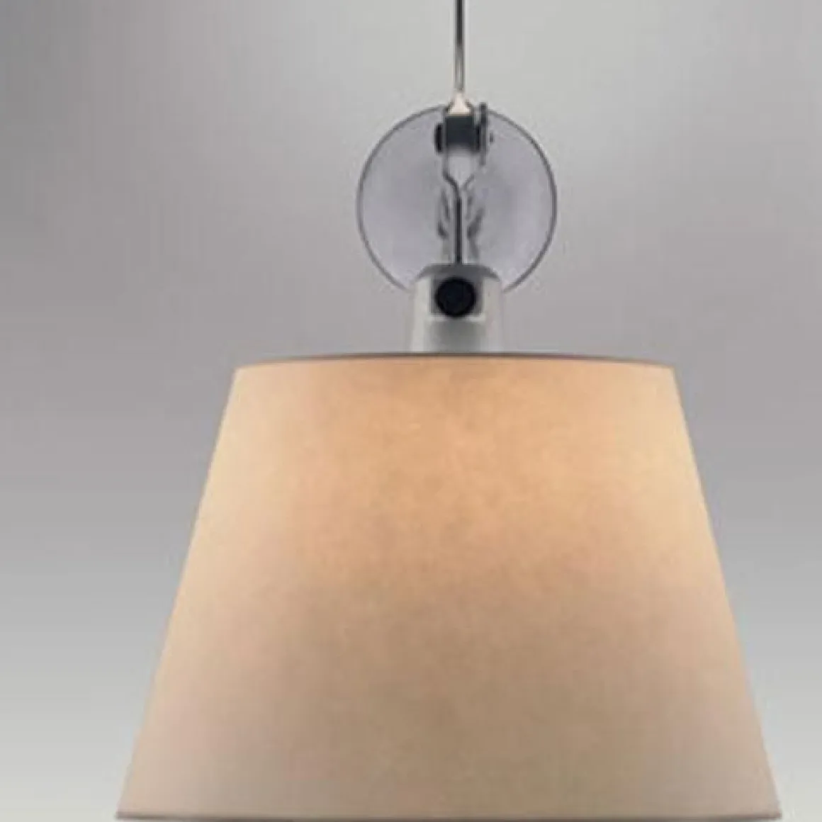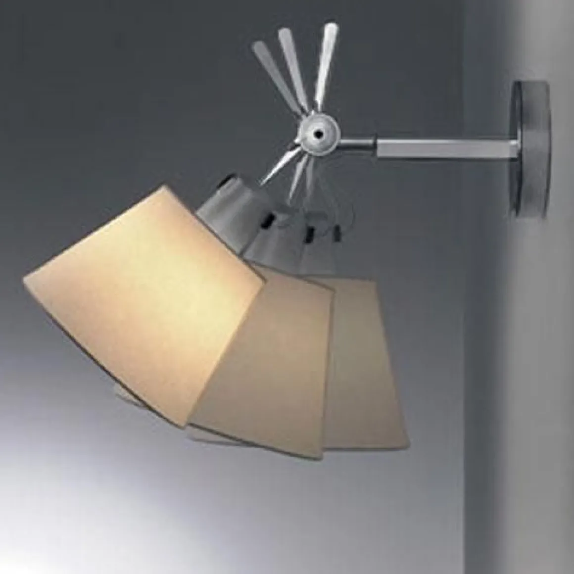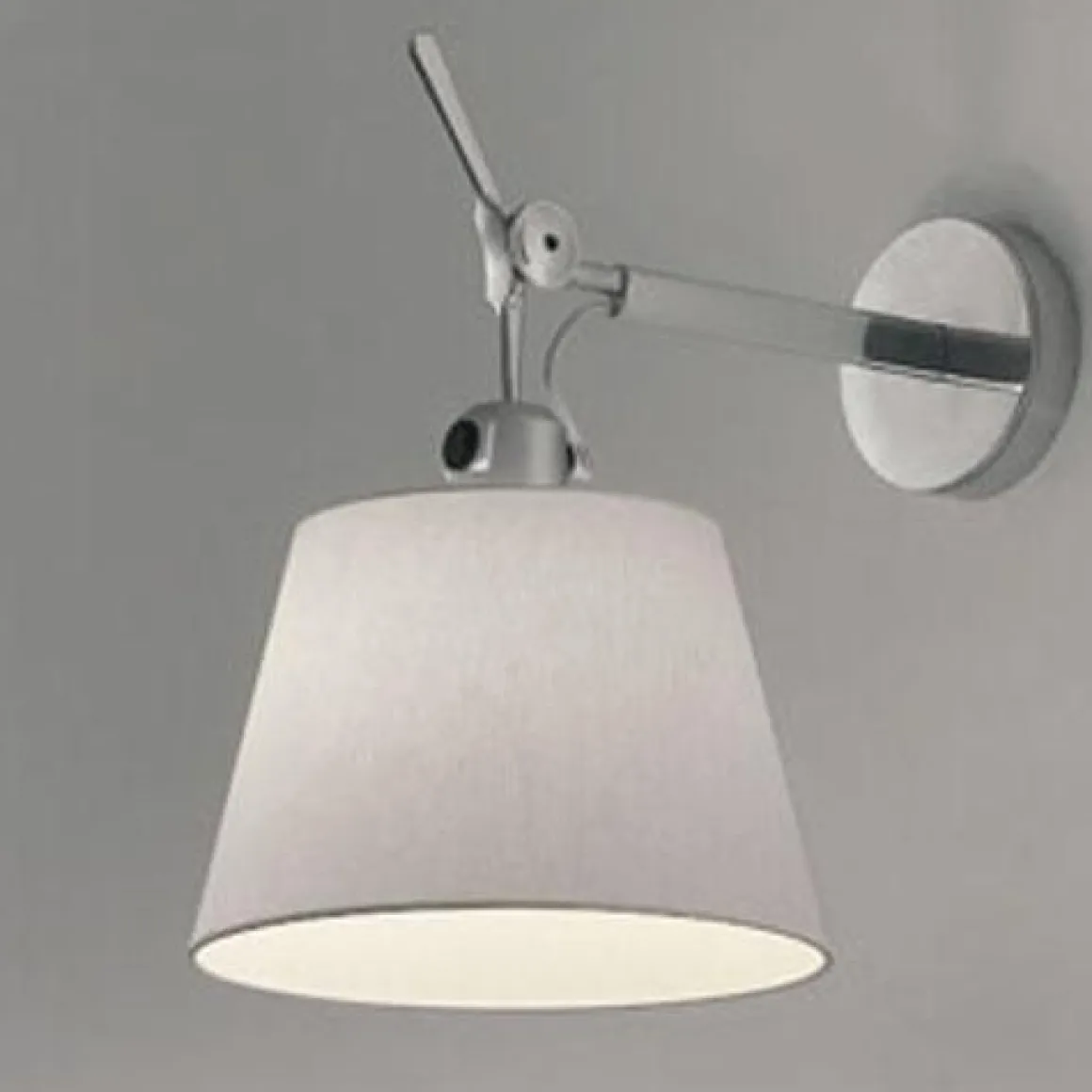 L’applique Tolomeo Parete Diffuseur de Artemide a un diamètre de 18 cm. Son bras en aluminium a une articulation permettant au diffuseur de tourner d’environ 30° perpendiculairement par rapport au mur. Le support de l’applique est en aluminium brillant, son bras en aluminium poli, et son diffuseur en papier parchemin écru ou en satin de soie gris aluminium.