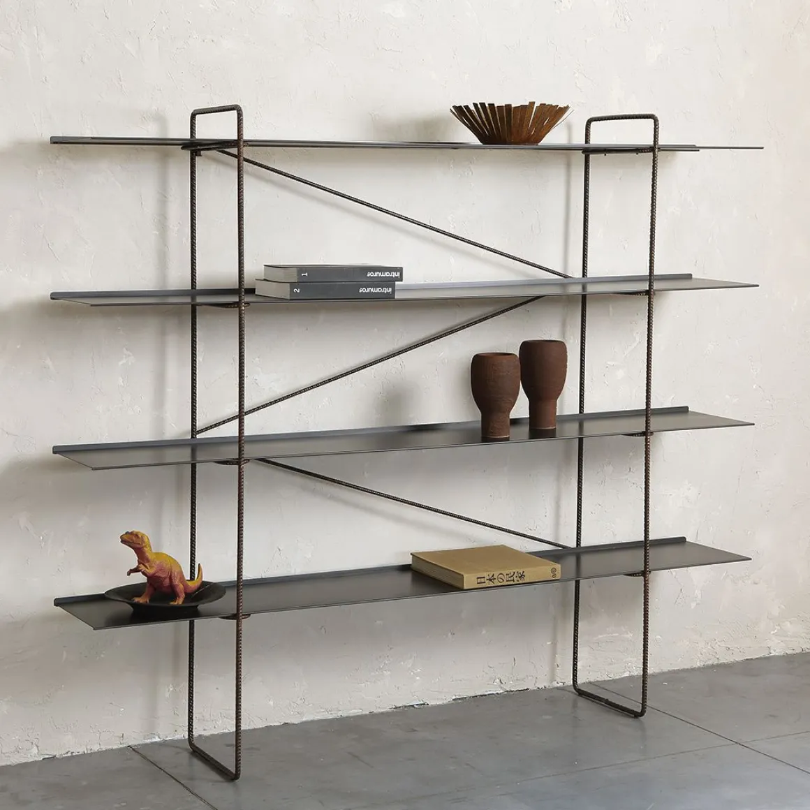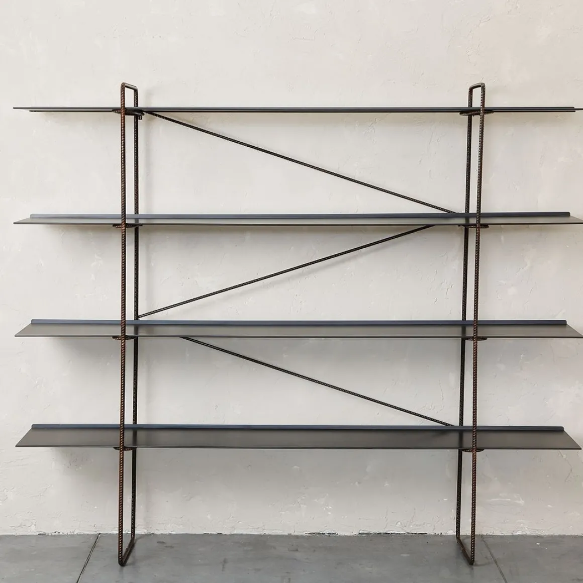 Bibliothèque murale, démontable. Structure en tige d’acier nervurée Ø14 mm. Finition naturelle laqué transparent opaque. Étagère en tôle d’acier naturelle découpée et courbée. Traitement phosphaté noir, fixation final avec de la cire d’abeille.