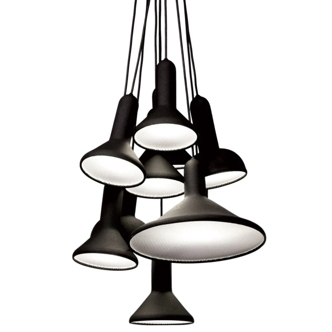 – Taille 2 (S10) : bouquet 10 lampes (6 cônes Ø 15 cm + 3 arrondies Ø 15 cm + 2 cônes 30 cm / Ø totale ~ 40 cm) – 10 x 9W fluo E27 (non fournies) – L câbles 180 cm