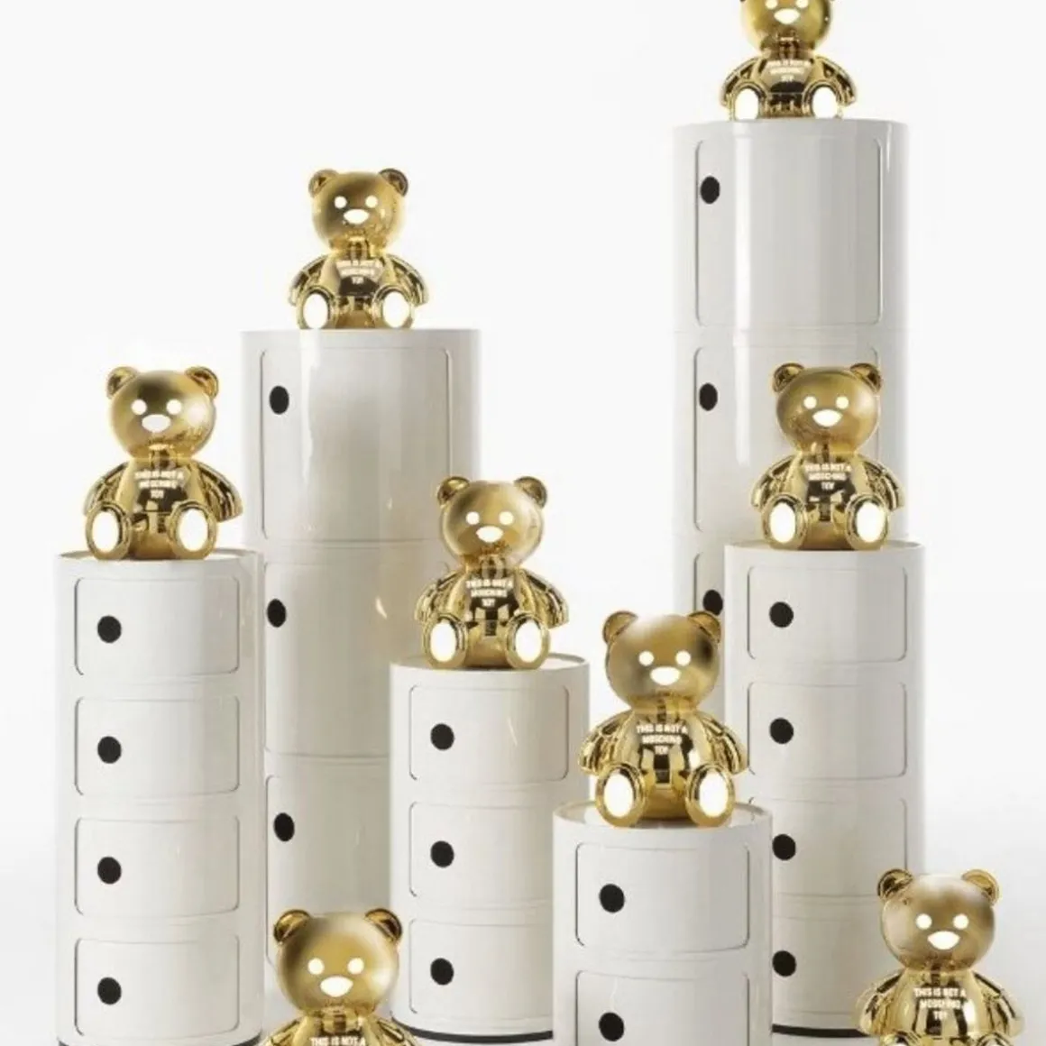La lampe Toy, design Moschino by Jeremy Scott, se présente dans une toute nouvelle et brillante finition or métallisé, qui va enrichir le côté glamour du fameux ourson : l’élément d’ameublement se fait précieux.