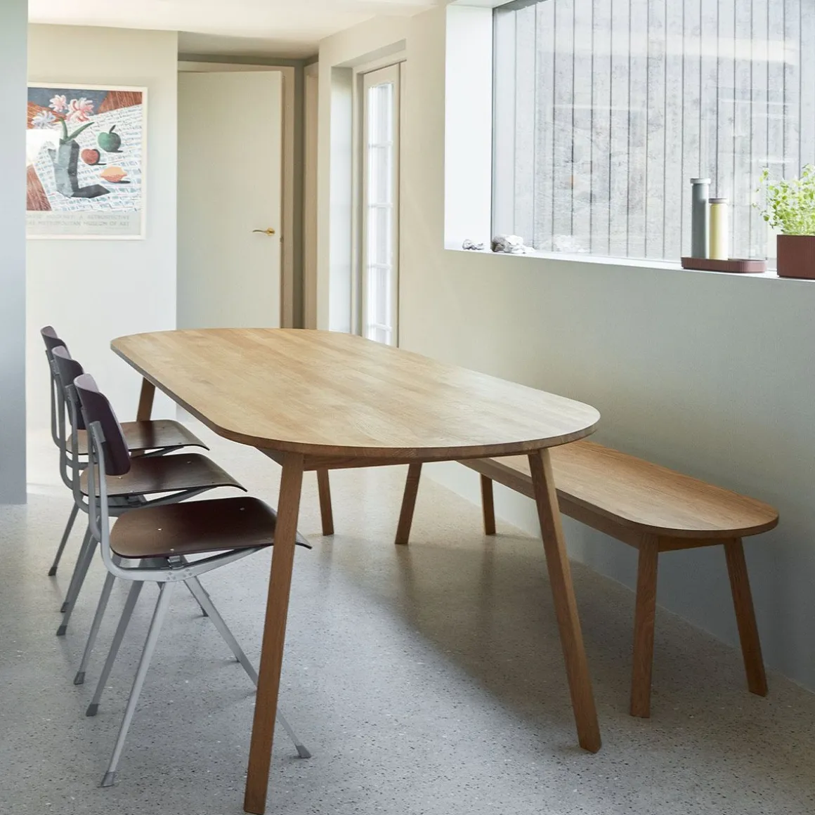 Triangle Leg Table de Hay. Motivé par le désir de créer plus d’espace autour d’une table ronde, Simon Jones a conçu la série de tables et de bancs à pieds Triangle. Les extrémités rectangulaires du plateau de table et du banc ont été arrondies, créant un cadre convivial qui maximise le nombre de places assises autour de la table. Fabriquée en chêne massif avec une finition huilée ou laquée transparente, cette série polyvalente convient à une large gamme d’environnements de restauration ou de bureau privés et publics.