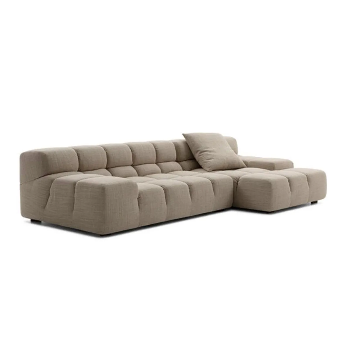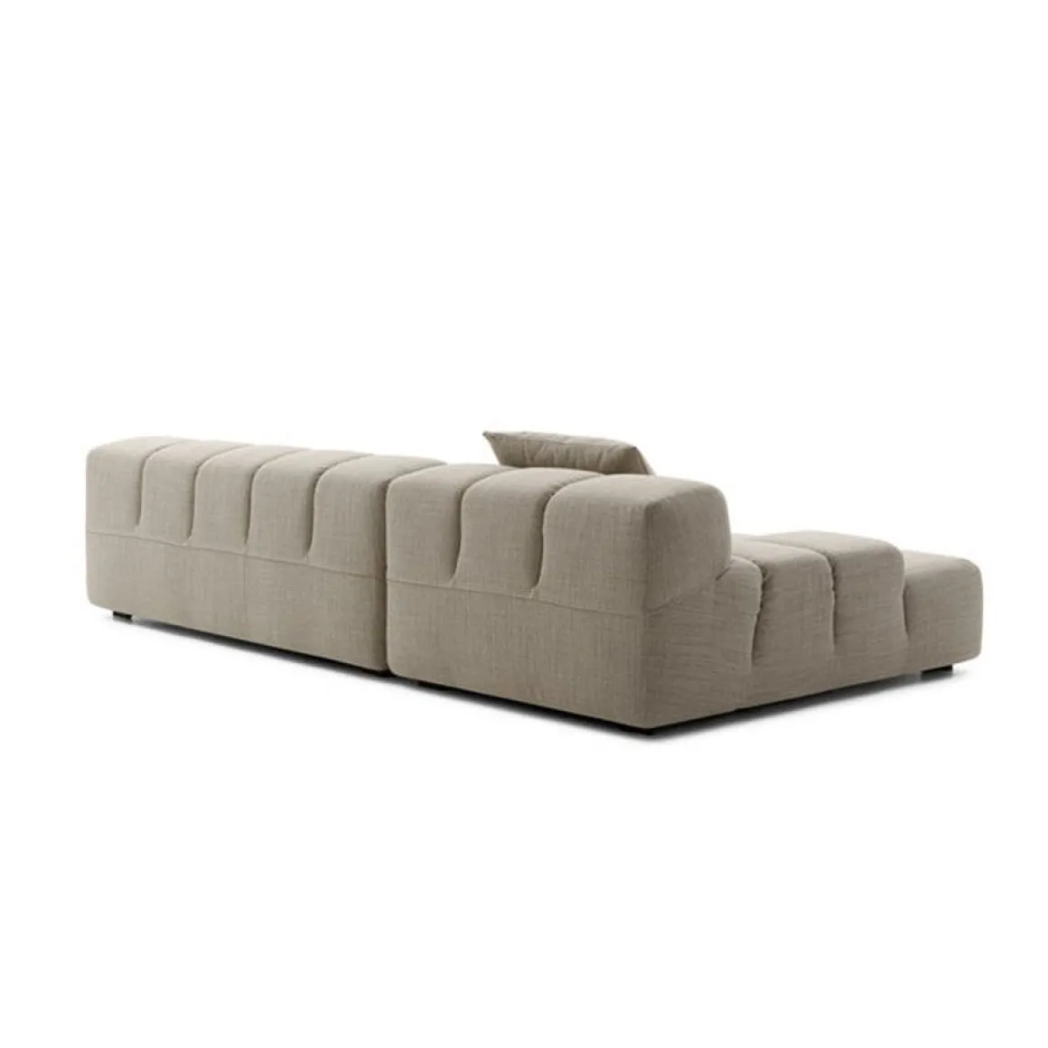 La série Tufty-Time, un des plus solides succès de B&B Italia, apporte des réponses efficaces aux thèmes de la modularité, du confort et du déhoussable. Le système modulable Tufty-Time commence par un pouf comme pièce de base, qui s’accompagne ensuite d’éléments centraux, d’angle et terminaux avec accoudoir bas ou haut. En composant ces différents éléments, on invente un canapé classique, un canapé à méridienne, un canapé d’angle ou en îlot qui permet une assise à 360 degrés. Ses profondeurs douillettes deviennent un lieu de rendez-vous, un refuge accueillant pour se détendre. Le style libre et informel du revêtement offre une touche plus contemporaine que le Chesterfield et les canapés capitonnés classiques.
