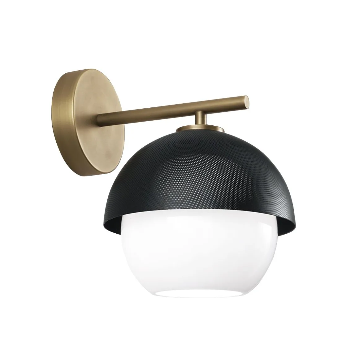 Applique à lumière diffuse. Structure en laiton bruni clair ou foncé avec abat-jour en métal perforé or mat ou noir mat. Diffuseur en verre soufflé de Murano blanc.
