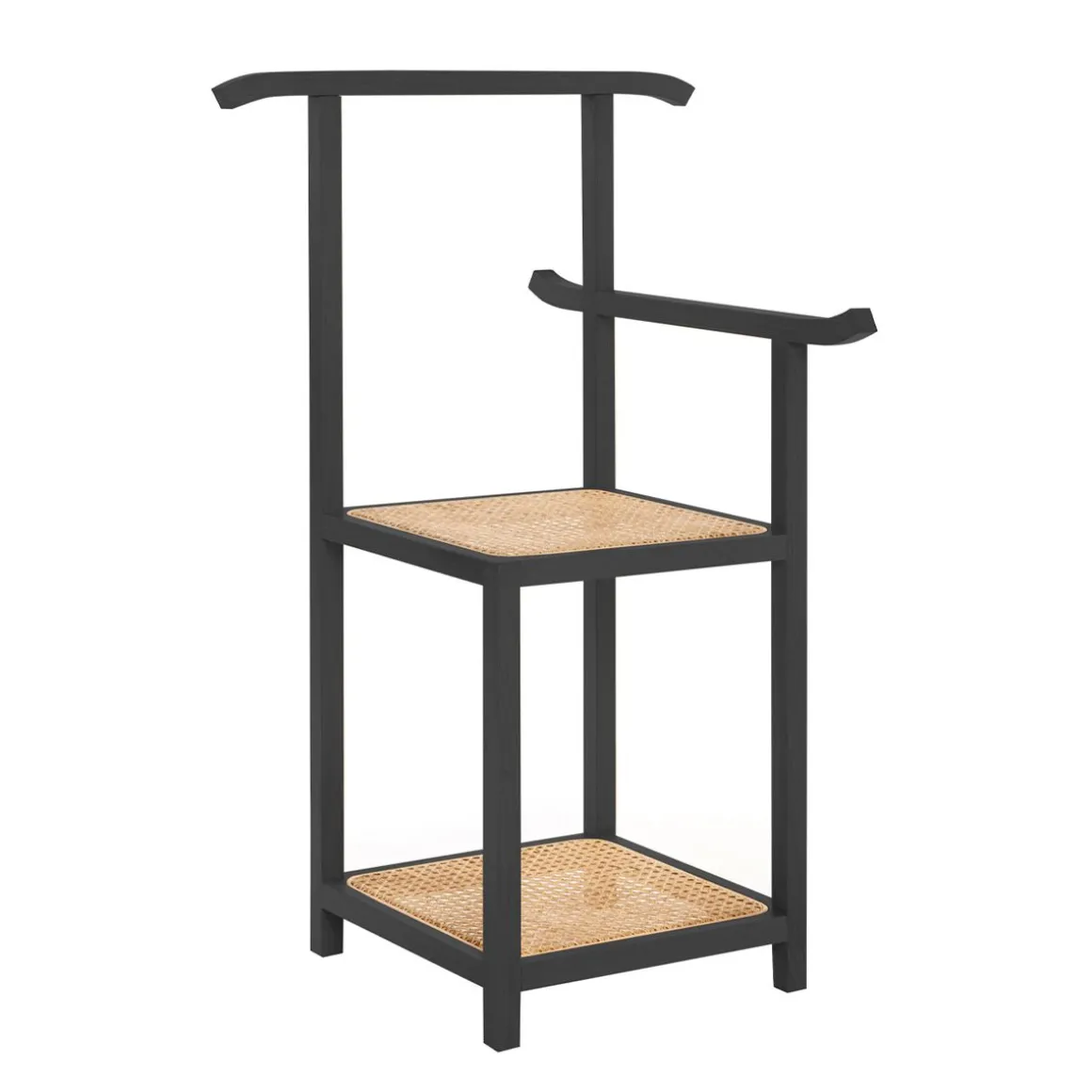Designer originaire de Singapour, Nathan Yong signe une pièce au style minimaliste, avec des références orientales. Fonctionnel, ce meuble 2-en-1 fait office de valet et de chaise : pratique pour s’asseoir afin d’enfiler ses chaussures ! L’étagère située sous l’assise permet de ranger vos sacs et souliers. Le dossier et l’accoudoir servent de cintres pour suspendre vos vêtements ou serviettes. Majordome trouve sa place dans une chambre ou une salle de bains. Majordomo se compose d’une structure en frêne hêtre massif à section carrée. L’assise et l’étagère sont en cannage de paille naturelle.