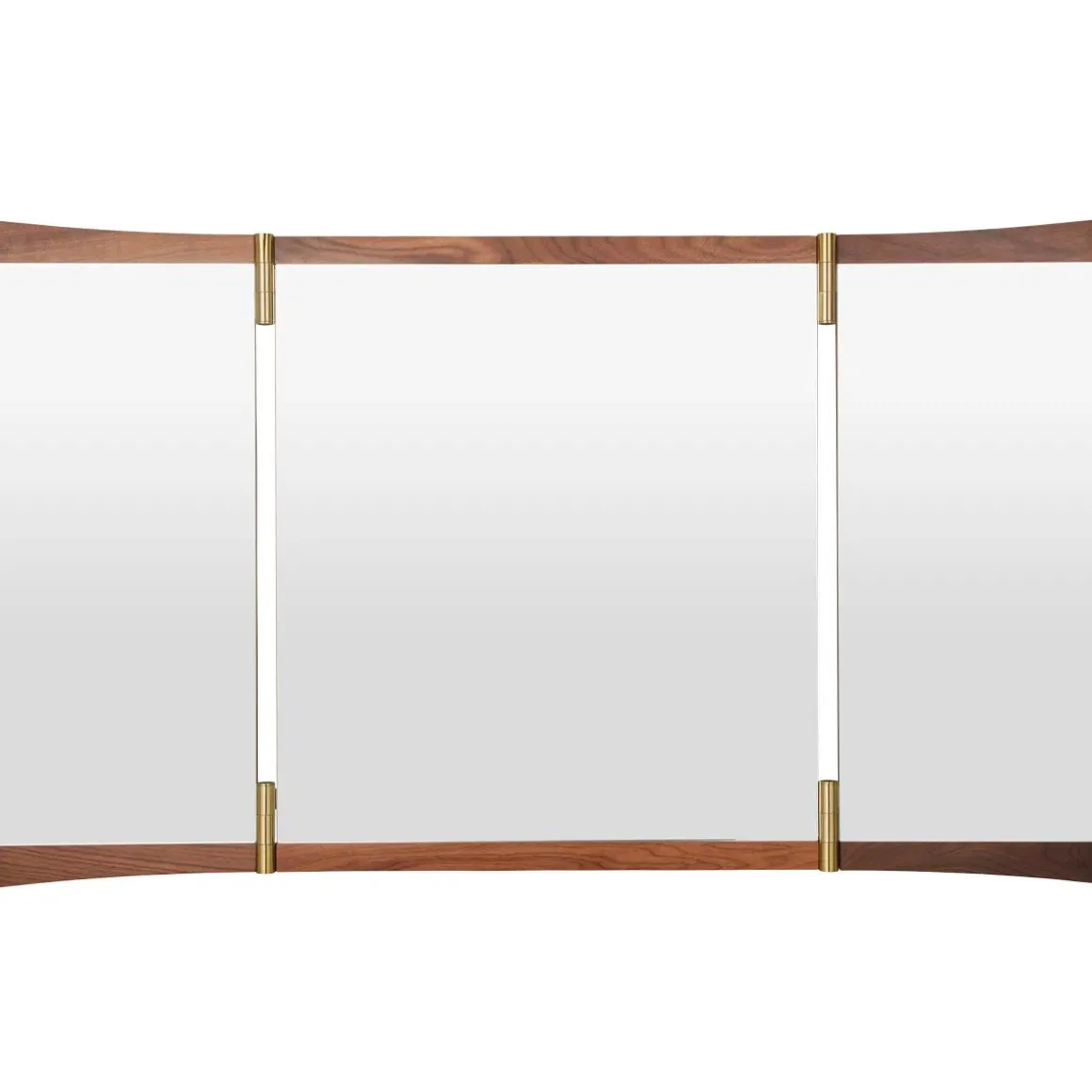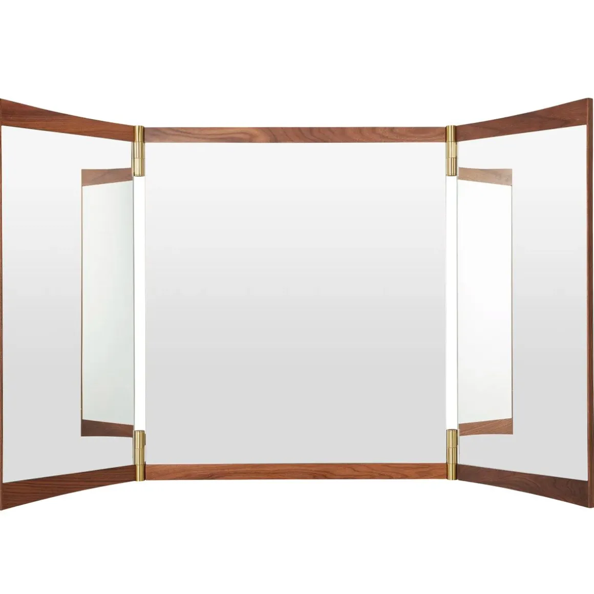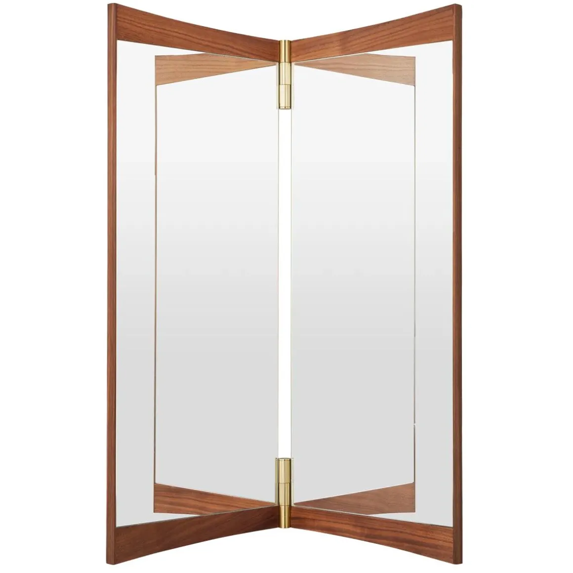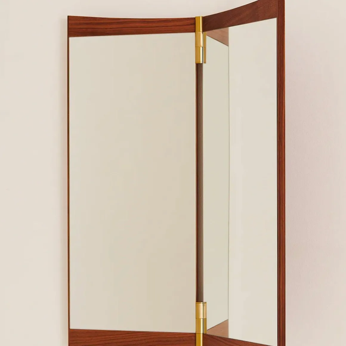 Vanity miroir de Gubi par GamFratesi. Echo contemporain du miroir de coiffeuse du XVIIIe siècle qui lui donne son nom, la collection Vanity Mirror est le deuxième miroir mural conçu par GamFratesi pour GUBI. Les caractéristiques déterminantes du design sont son placage en noyer chaleureux et ses charnières en laiton. Ceux-ci permettent d’ajuster l’angle du miroir, influençant la perspective qu’il offre et les jeux de lumière dans la pièce. Sur le miroir vanity 1 à panneau unique, les charnières permettent une rotation de 15°, tandis que les charnières de 180° du miroir vanity 2 et du miroir vanity 3 permettent aux panneaux de se replier.