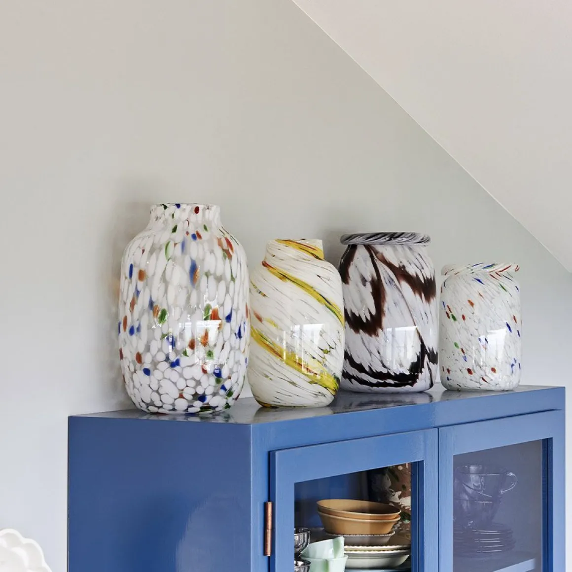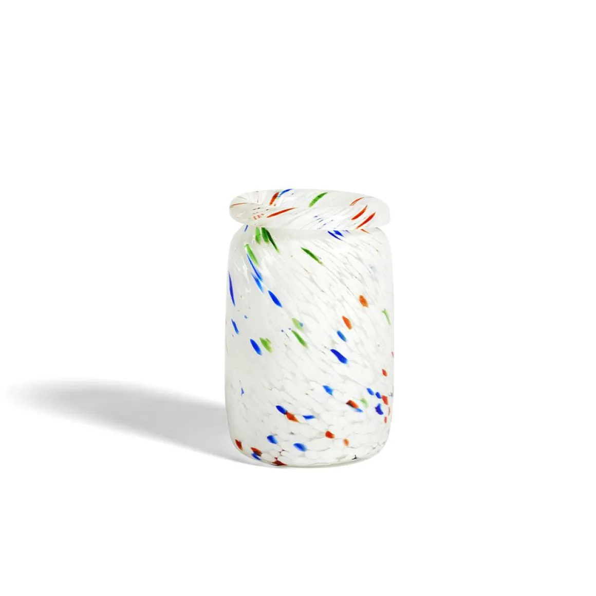 Vases Splash de Hay. Fabriqué à la main en utilisant une technique spéciale de soufflage de verre qui implique plusieurs couches de points de verre colorés, le vase Splash présente un motif tourbillonnant unique. Disponibles en différents modèles et tailles, les vases peuvent être utilisés à la fois pour exposer des fleurs et comme objets décoratifs.