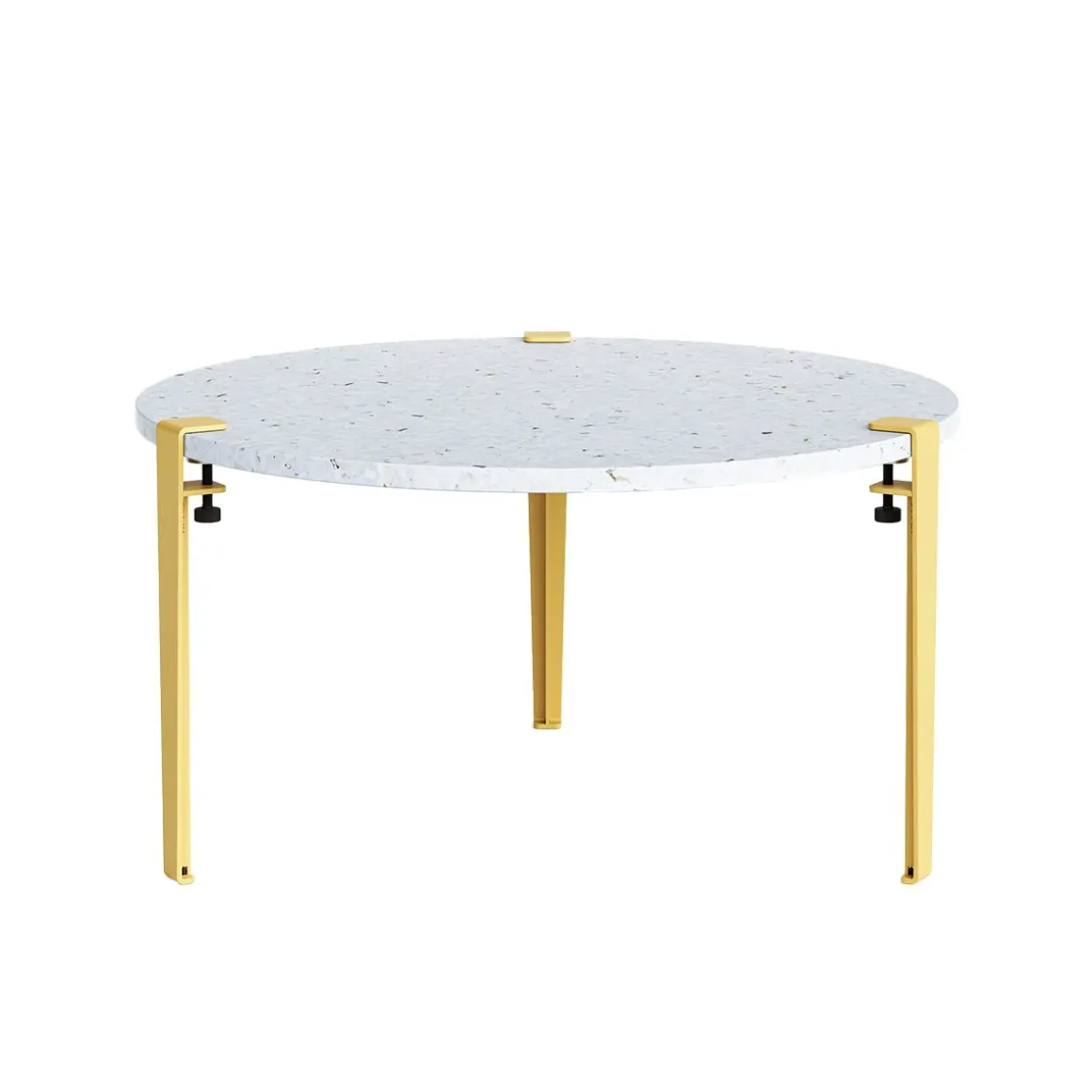 La table basse VENEZIA est composée de 3 pieds de table basse TIPTOE et d’un plateau en plastiques recyclé diamètre 80cm. Le plateau de la table VENEZIA est fabriqué à partir d’une centaine de pots de yaourts ! Ceci explique la couleur blanche du plateau. Les éclats colorés, or et argent, qui proviennent des garments d’étiquettes sont autant d’indices d’une vie antérieure !