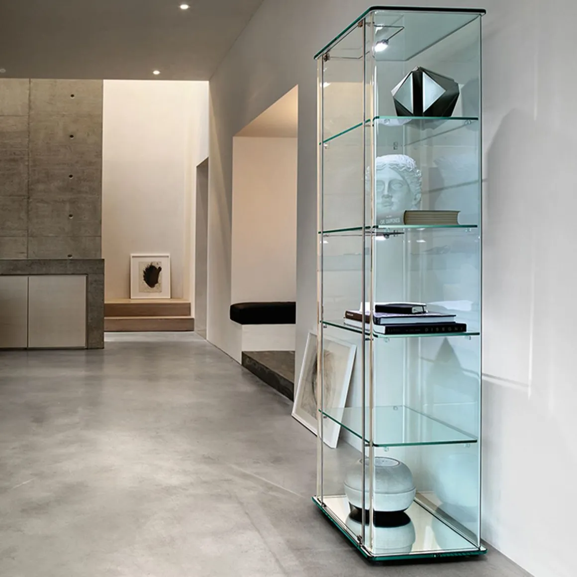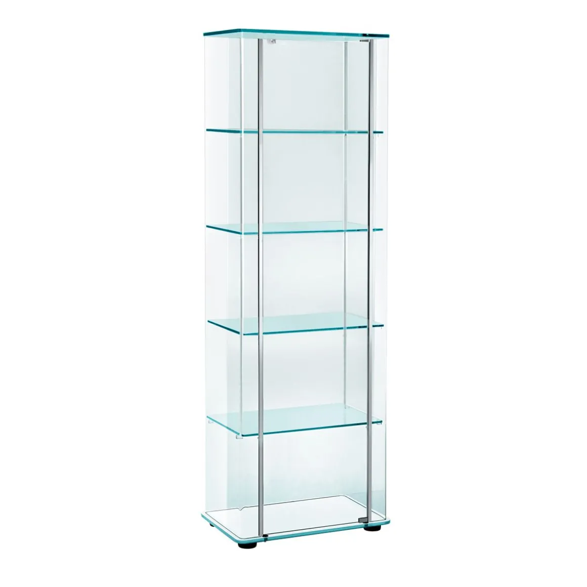 Milo Day est une vitrine en verre cintré transparent, porte en verre de 6mm avec serrure, supports d’étagère en verre soudés à la structure. Base en verre de 12mm disponible en verre extralight dépoli verni dessous blanc ou en extralight argenté. Plateau en verre de 8mm. Pré-équipée pour le kit d’éclairage.