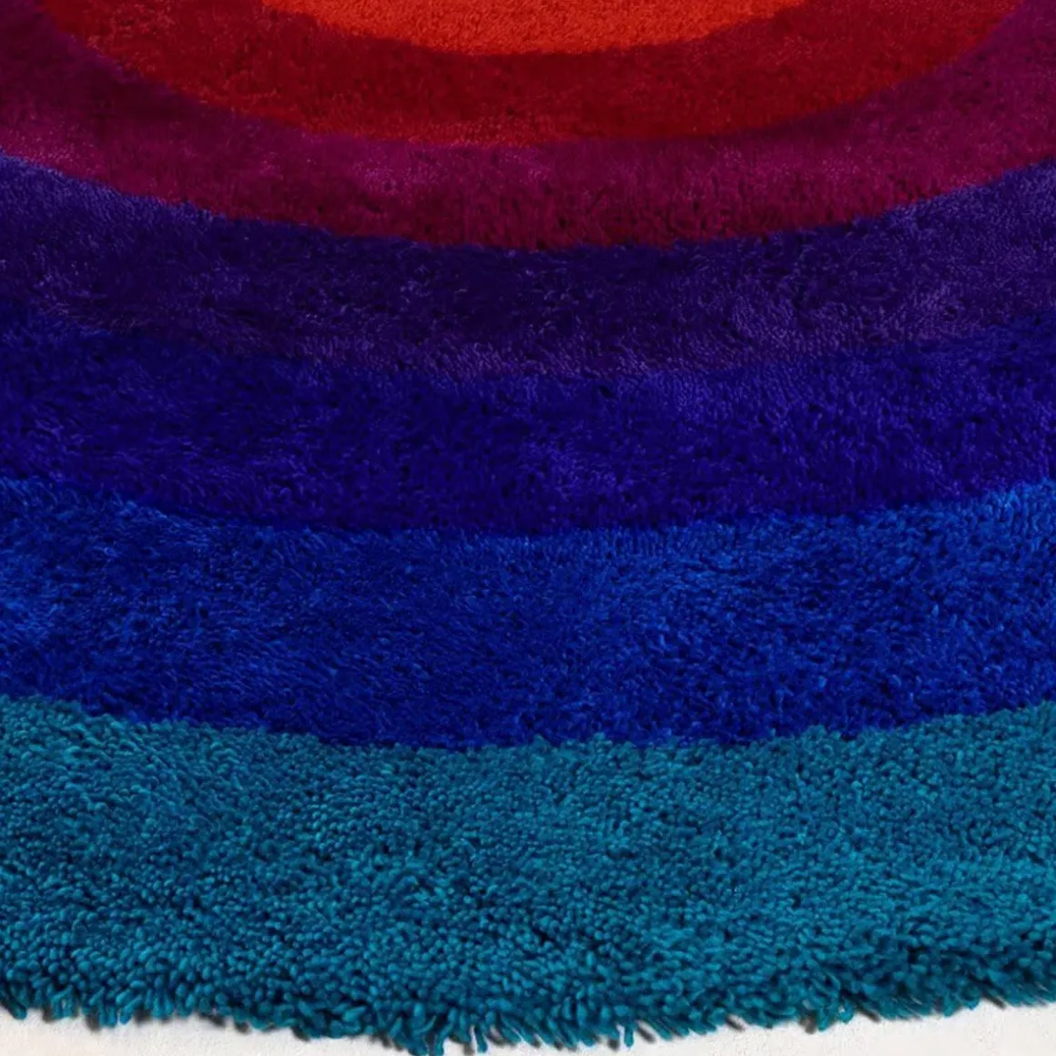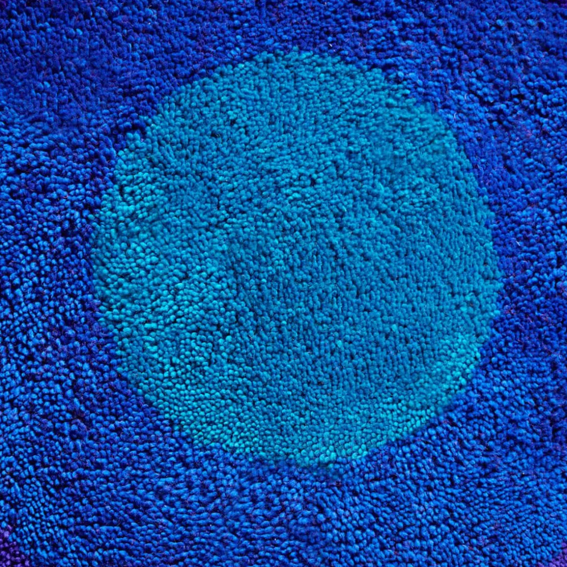 VP Romantica Circle de Amini par Verner Panton. La couleur est forme et la forme est couleur dans cette collection qui propose six tapis basés sur la série de couleurs de Panton et les géométries pures du cercle, du carré et de la vague. Les tapis Romatica sont noués à la main avec un poil long et légèrement hirsute en utilisant de la laine néo-zélandaise de première qualité. Les tapis carrés et ronds, avec un motif de cadres concentriques, sont également disponibles dans la variante avec la série de couleurs inversées. Les tapis à vagues, en deux formats, se distinguent par un fond violet.