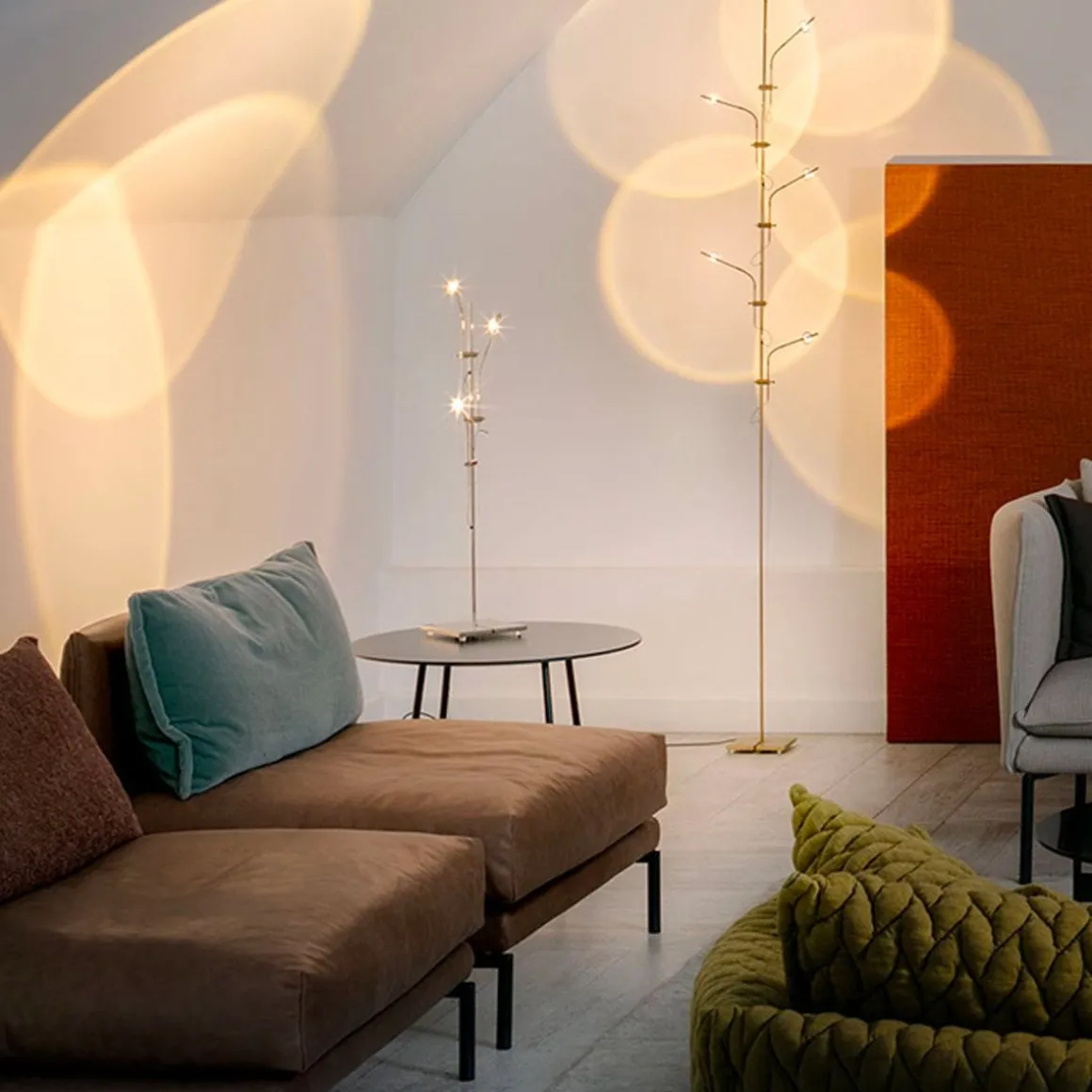 Une lentille en verre amovible définit la lumière subtilement dispersée des LED 1W appliquées aux tiges nickelées des différents modèles différents, y compris Herem, Miss Stick, UAU, WA et WA WA. Ils ont également des supports flexibles qui vous permettent de diriger les faisceaux lumineux.