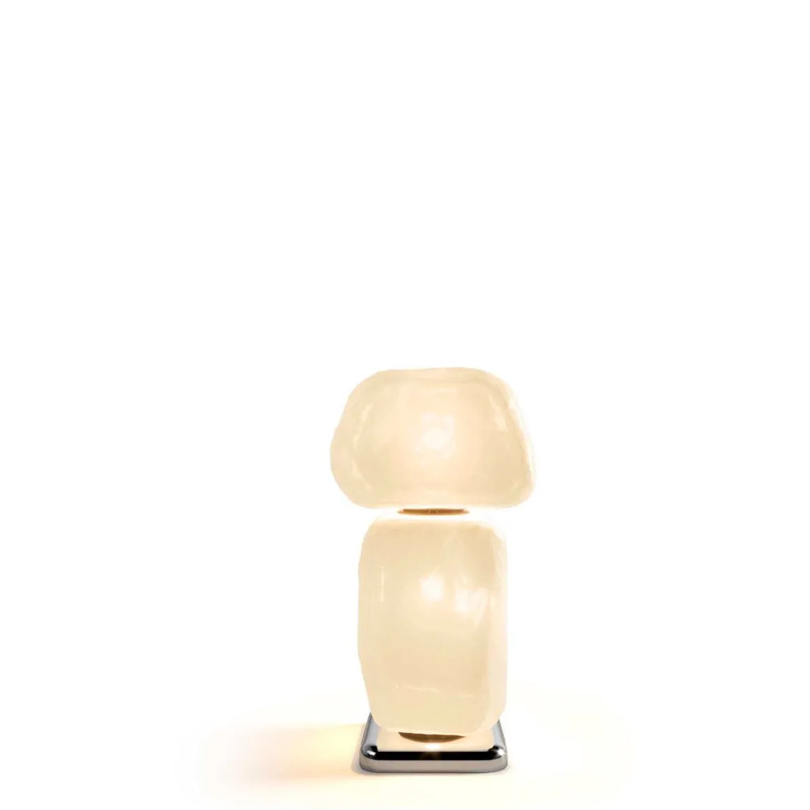 Wax de Cassina par Linde Freya Tangelder. Wax, Stone, Light de Linde Freya Tangelder développe l’idée originale de blocs sculpturaux empilés de façon précaire pour former une colonne architecturale apparemment instable. Intriguée par les matériaux liquides qui changent de forme pour devenir solides, la designer a commencé à expérimenter le verre pour découvrir les multiples facettes de ce matériau, en jouant avec les transparences, les sensations tactiles et la lumière afin de créer non seulement un objet, mais aussi une atmosphère. La collection se compose de cinq colonnes totémiques de différentes tailles, réalisées avec des cubes de verre de Murano soufflés par des artisans à l’intérieur de moules en fonte. Les éléments, empilés verticalement les uns sur les autres, sont reliés au centre par un tube LED qui éclaire l’ensemble de l’œuvre d’une lumière chaude.