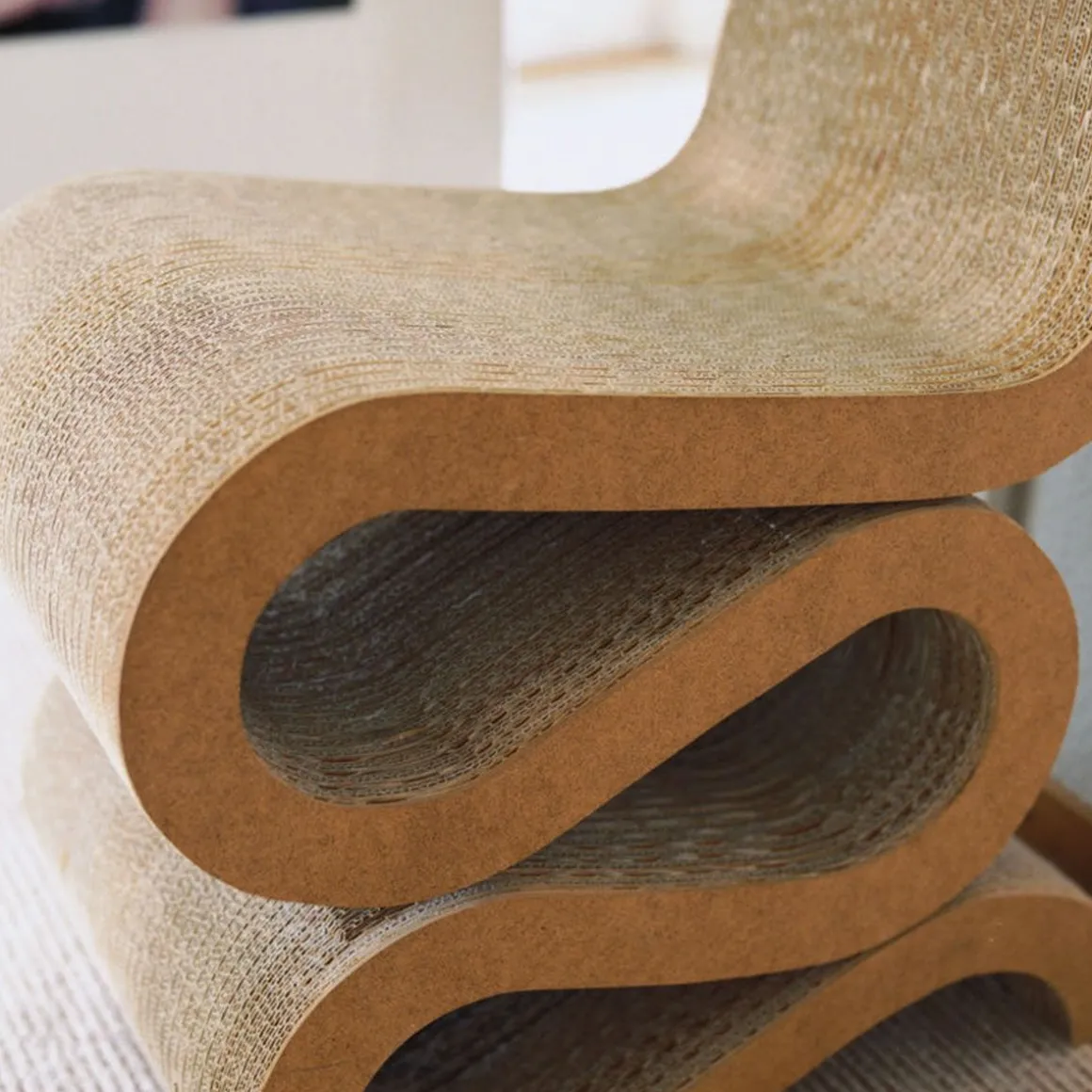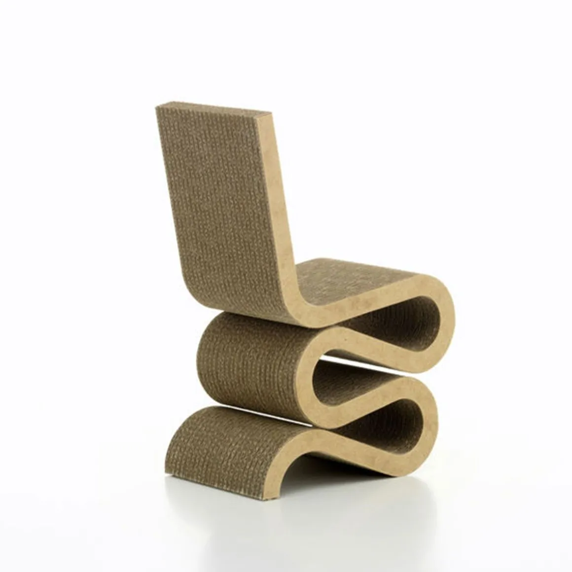 Le Wiggle Side Chair fait partie de la série de meubles « Easy Edges » créée par Frank Gehry en 1972, à travers laquelle il a conféré une nouvelle dimension esthétique à un matériau aussi banal que le carton. Le siège sculptural est non seulement très confortable, mais aussi durable et robuste.