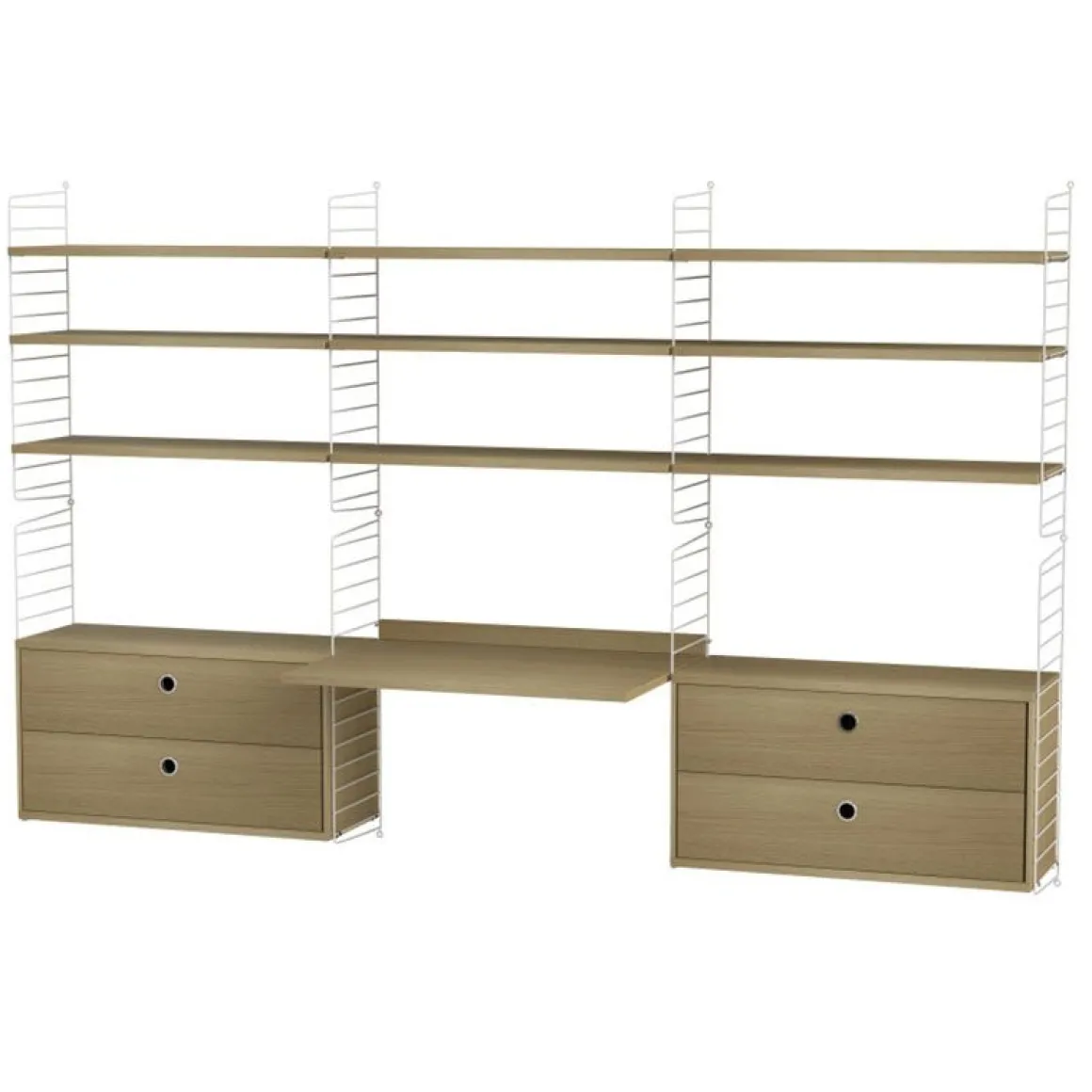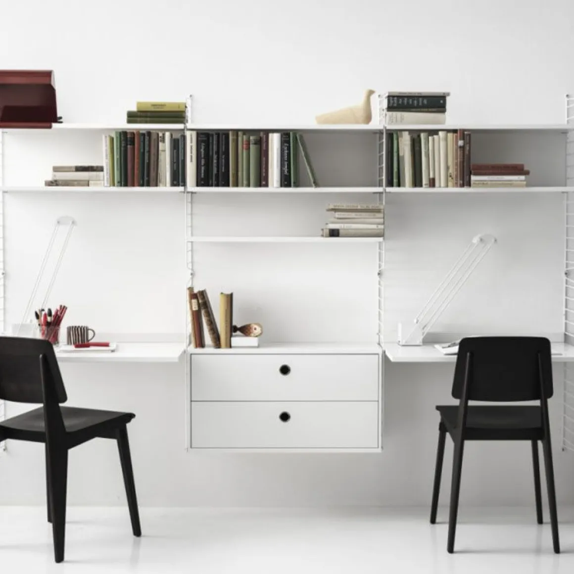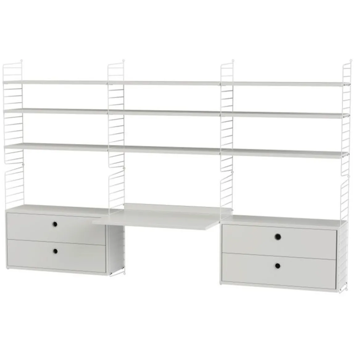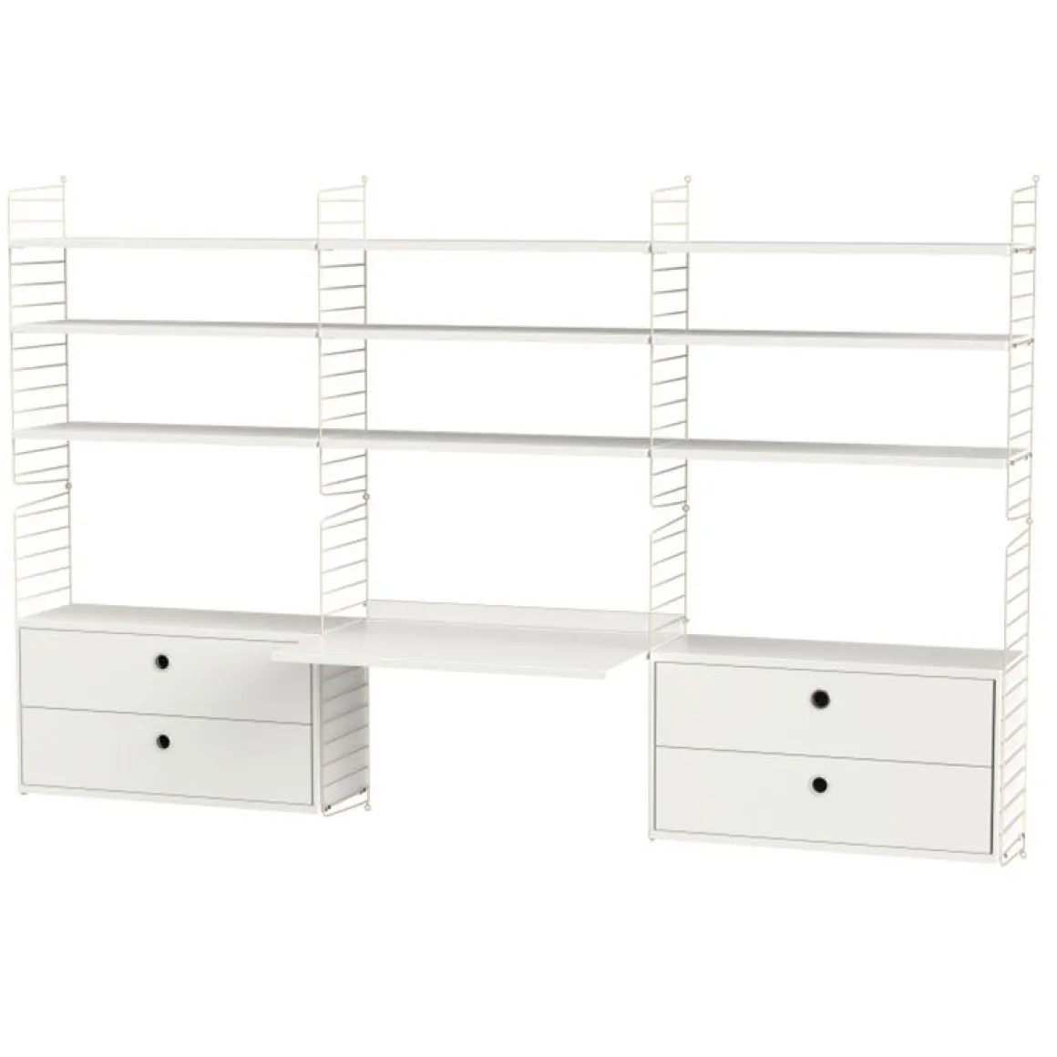 Que votre espace de travail soit situé au bureau ou à la maison, nous avons la solution qui couvre tous vos besoins. Pour l’espace de travail plus spacieux, nous avons cette combinaison murale avec de nombreuses étagères, des armoires et un bureau au milieu.