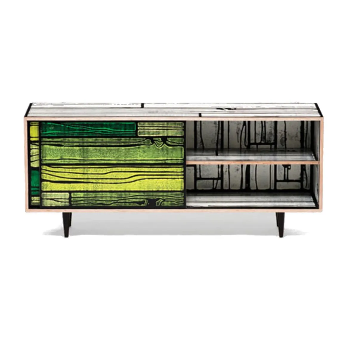 Le mobilier »WrongWoods » a été dessiné par le designer Sebastian Wrong et décoré par l’artiste Richard Woods dans le cadre de son projet »Collaborations », Established & Sons. Un duo explosif qui réinterprète de façon audacieuse et ultra originale le mobilier moderniste d’après-guerre. Ces meubles en contreplaqué sont habillés d’un imprimé façon cartoon imitant des planches de bois coloré. Ces motifs aux coloris vifs sont à la fois classiques et dissonants. Le résultat, volontairement osé et tape-à-l’oeil est une façon pour Richard Woods de ridiculiser le faux bon goût des intérieurs bourgeois. Un style british survitaminé, plein de fantaisie qui amuse par son ironie.
